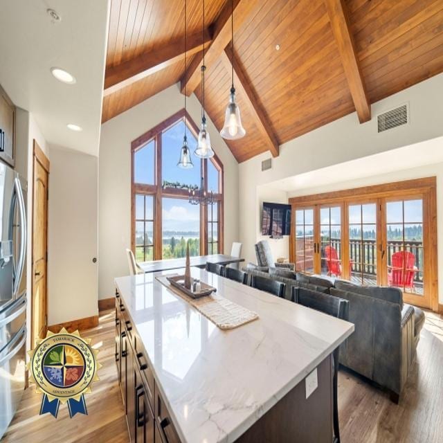 Stay at Aneroid, a luxurious condo in the historic Litch Hotel, combining modern comforts with vintage charm. Enjoy soaring 15ft ceilings, hardwood floors, stone walls, quartz countertops, and handcrafted Olaf dishware. The bathroom includes a makeup station for added convenience. Main floor: king bed; mezzanine: king bed. Pet-friendly! Located minutes from Joseph and Wallowa Lake, guests rave about our top-notch communication, detailed guidebook, and seamless self check-in.