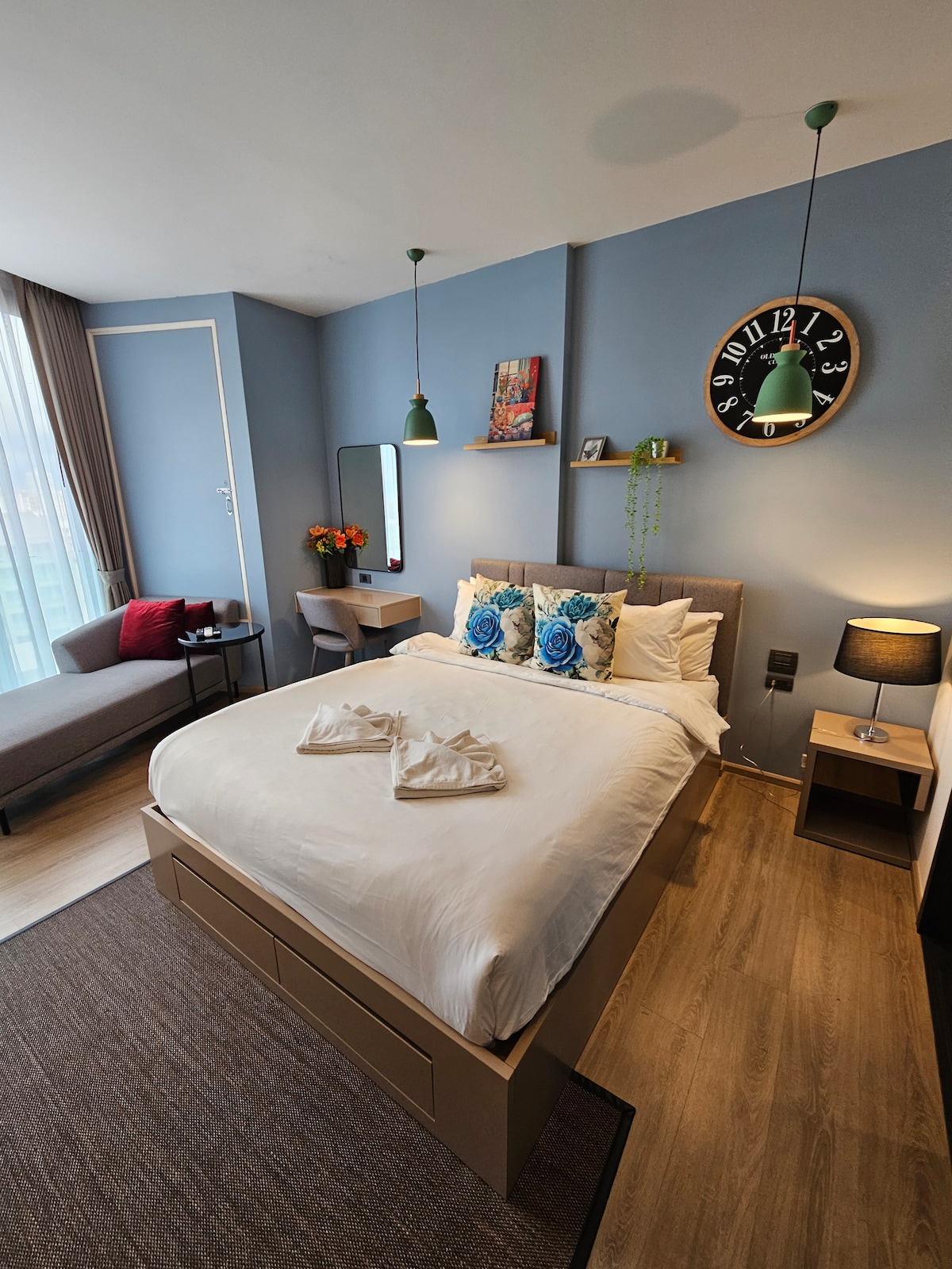 Amplia habitación dúplex en Luxe Residence, un apartamento de servicio ubicado en el centro de Pattaya, en la calle justo al lado de Food Land y Harbor Mall. La elegante habitación está equipada con una cama tamaño king, una pequeña cocina con nevera y microondas, un baño privado y una terraza. La habitación se encuentra en el primer piso y es accesible sin pasar por un vestíbulo, para mayor privacidad, excepto para el registro. Tienes acceso a la piscina en la azotea (4ª planta). El edificio no cuenta con ascensor.