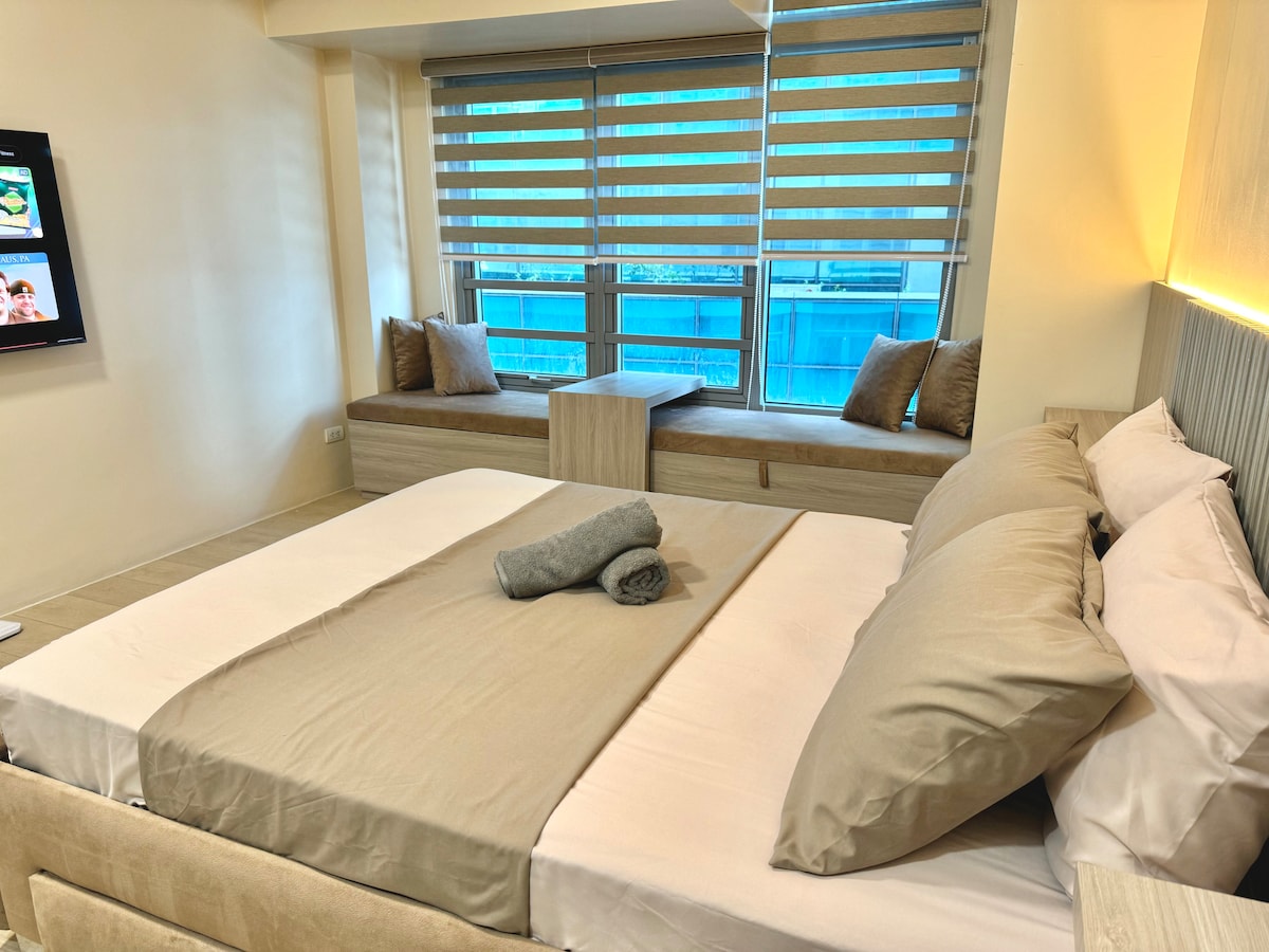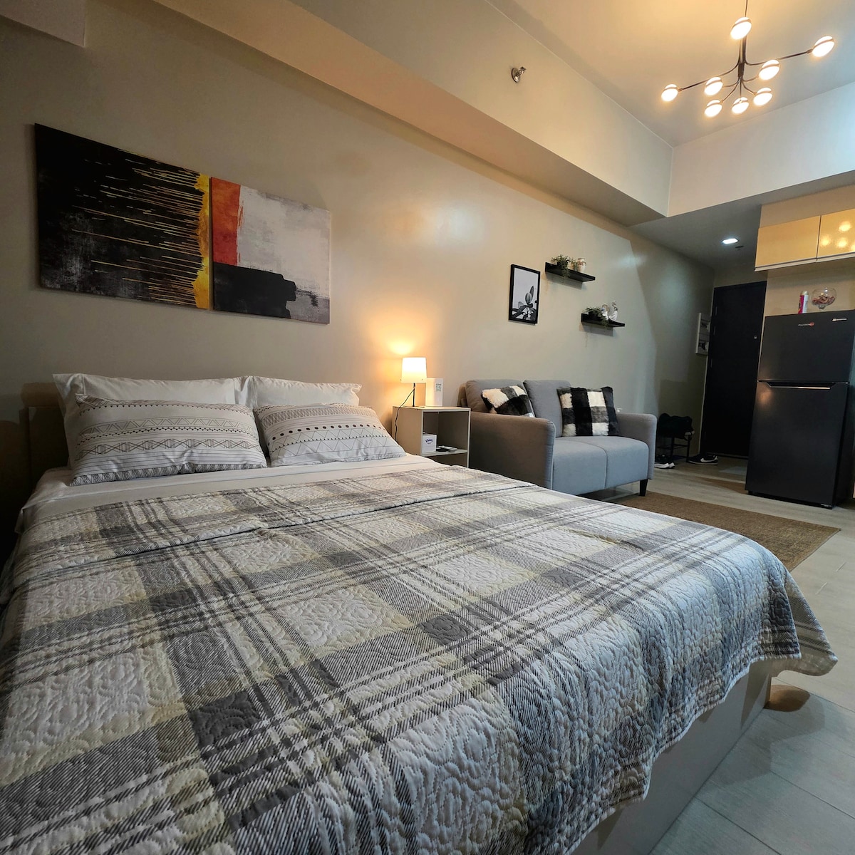 ¡Te damos la bienvenida a tu acogedor hogar en Eastwood City! Este luminoso y elegante apartamento es perfecto para viajeros de negocios, parejas y vacaciones. ◆ Cama tamaño queen de calidad hotelera para un sueño reparador ◆ Iluminación moderna e interiores luminosos y relajantes ◆ Aire acondicionado completo para mayor comodidad durante todo el día ◆ Wifi rápido ideal para trabajar o ver contenido en streaming ◆ Smart TV con Netflix y YouTube ◆ Cocina pequeña bien equipada ◆ Baño limpio con ducha fría y caliente ◆ Sofá cómodo y diseño cálido perfecto para relajarse después de un largo día