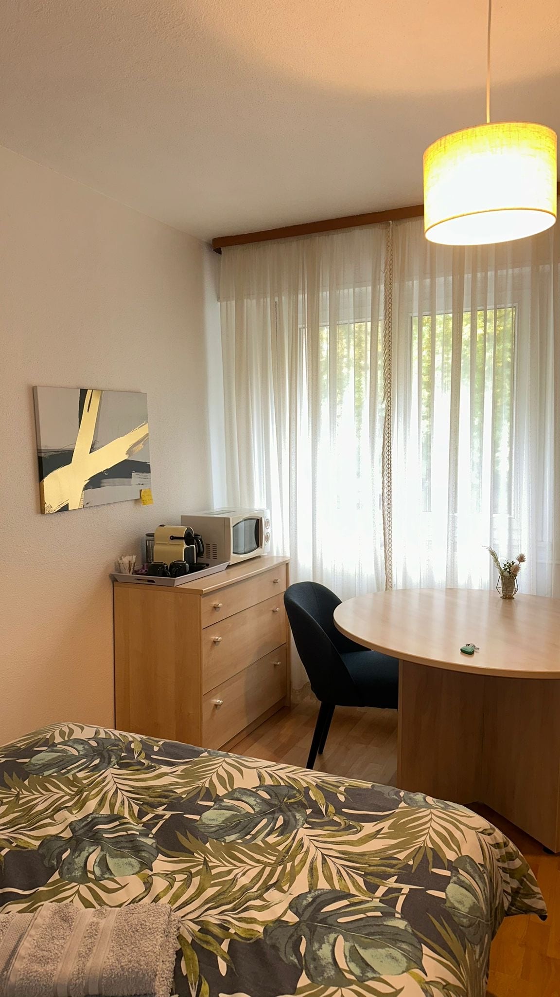 A 15 minutos del centro de Estrasburgo en coche, el estudio de 24 metros cuadrados amueblado a tu disposición, tendrás una gran mesa y un armario, una cama, una pequeña cocina americana con todo lo necesario (cubiertos, platos, nevera, placa eléctrica). Una gran ventaja son las plazas de aparcamiento dentro de la propiedad.