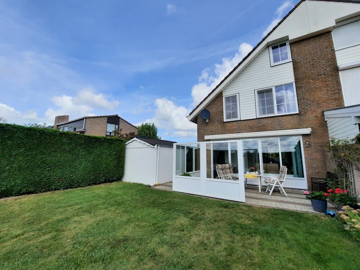 Bijgebouw in de tuin van een open bebouwing in een rustige buurt. De woning beschikt over een eigen keuken, living, slaapkamer, badkamer en privé terras. Privé parking en een afgesloten berging voor fietsen is beschikbaar voor gasten.(stopcontact voor het opladen van de batterij FIETSEN in de fietsenstalling)