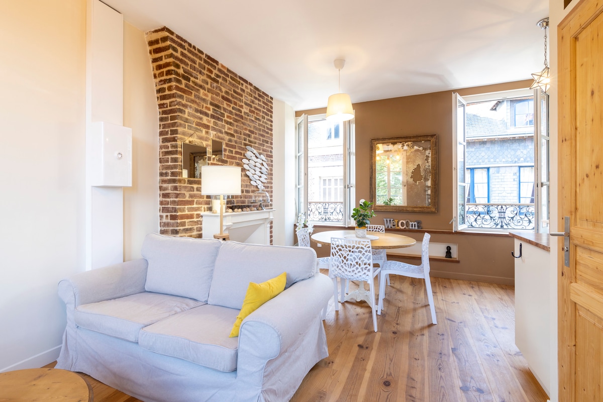 Les Câlins d'Honfleur was born out of a love affair with the town of Honfleur, its atmosphere, its narrow streets, its old basin. I imagined a welcoming place, in the heart of the historic district, 50 meters from the church of St. Catherine, easy to live, quiet and comfortable. Pierre's 41 M² apartment offers you all the comfort, a large separate bedroom with its Queen Size bed, a large living room / dining room with a fully equipped kitchen, a shower room and separate toilet.