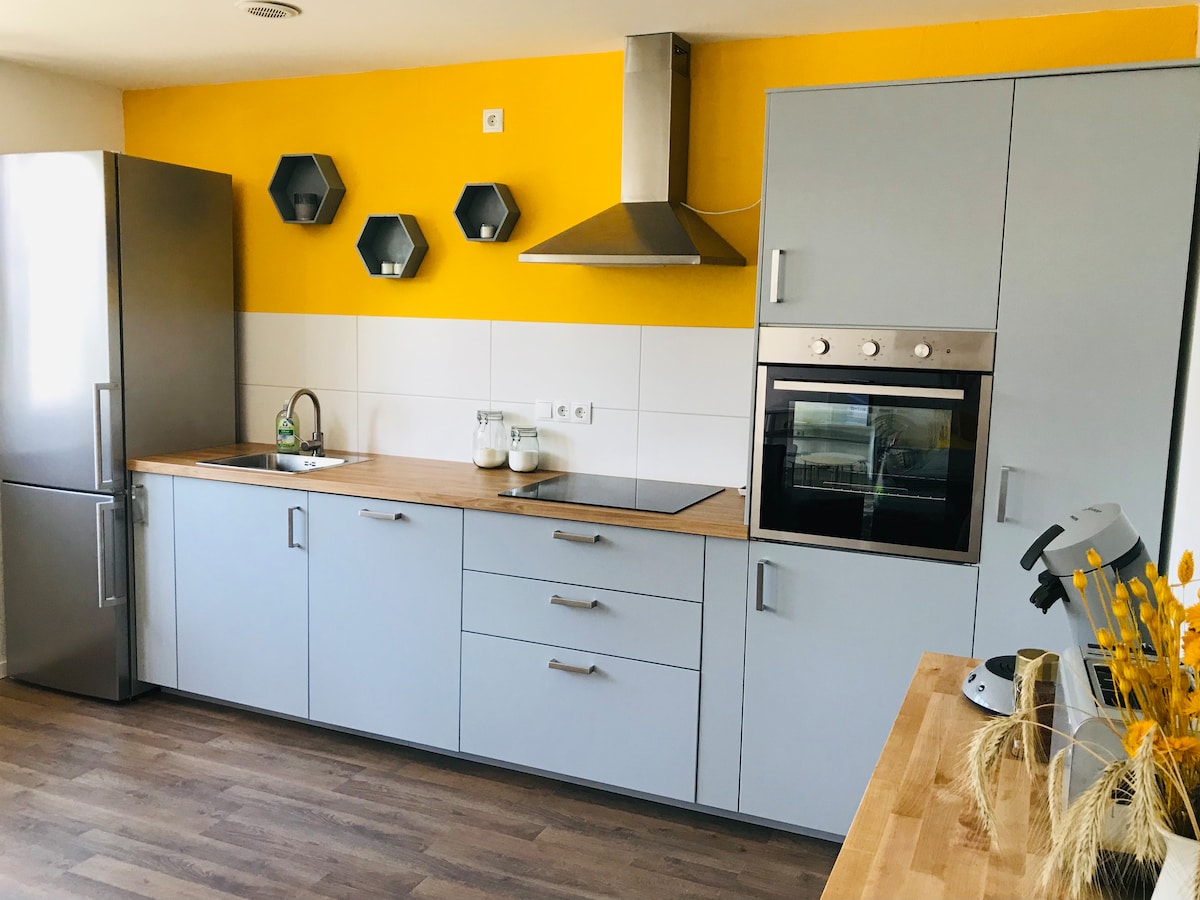* Free parking lot, garden pavilion and balcony * Living room with fireplace, reading corner, hanging chair and 4k TV * Family-friendly - high chair, travel cot, children's cutlery * New fully equipped kitchen - coffee, spices and snacks * 85 square meter maisonette apartment on the 1st floor * Workstation with office chair, external monitor and Lan connection * Air conditioning for dining area