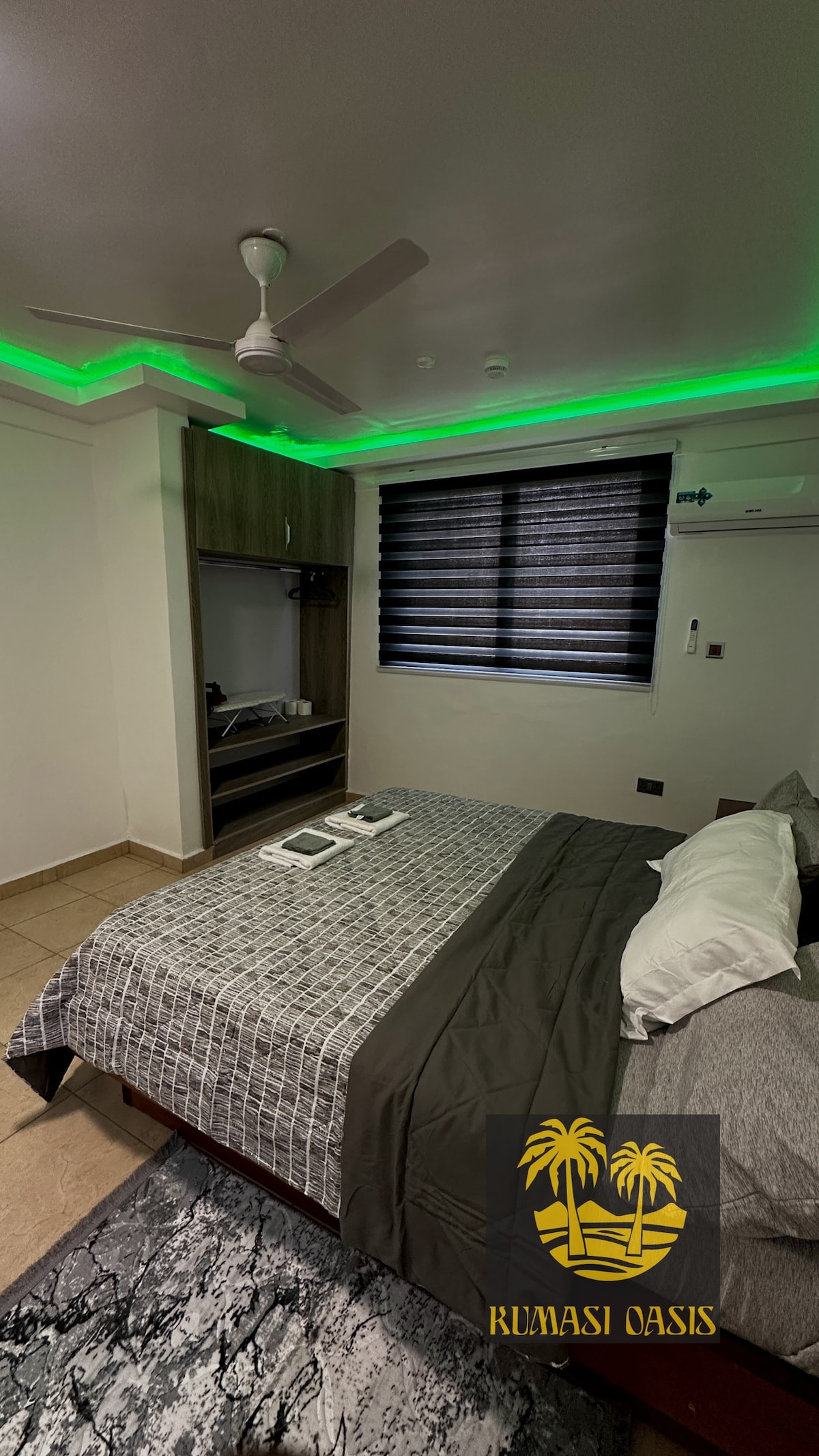 Te damos la bienvenida a nuestro espacioso refugio de dos dormitorios, donde el diseño contemporáneo se encuentra con vibrantes influencias africanas, creando un ambiente moderno acogedor y acogedor. Perfecto para familias o grupos pequeños. Convenientemente ubicado, solo tienes: A 5 minutos en coche de KNUST. A 12 minutos en coche del aeropuerto internacional de Kumasi. A 12 minutos en coche del centro comercial Kumasi City Mall. A 15 minutos en coche de Adum. A 20 minutos en auto de Rattray Park.