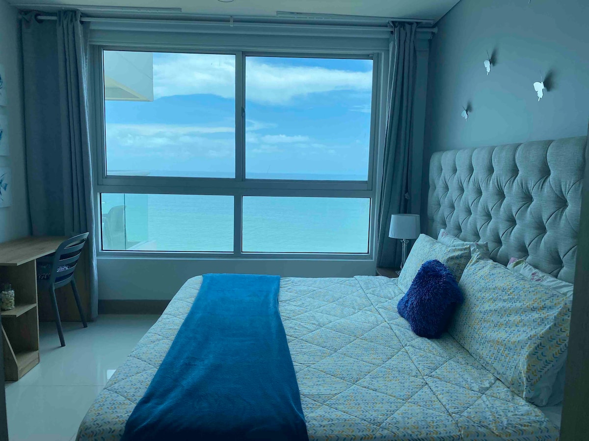 El lugar perfecto para disfrutar del lujo y la tranquilidad en Cartagena. Nuestra suite ofrece un ambiente exclusivo único con vistas frente a la playa del magnífico océano Caribe. Nuestra unidad ha sido diseñada para huéspedes que buscan disfrutar de la combinación perfecta entre ambientes zen y de alta gama. Escucha el chapoteo de las olas cuando te despiertes y cuando estés listo para un sueño profundo. Este moderno edificio también cuenta con servicios de primer nivel como gimnasio, jacuzzi y su popular piscina infinita con impresionantes vistas.
