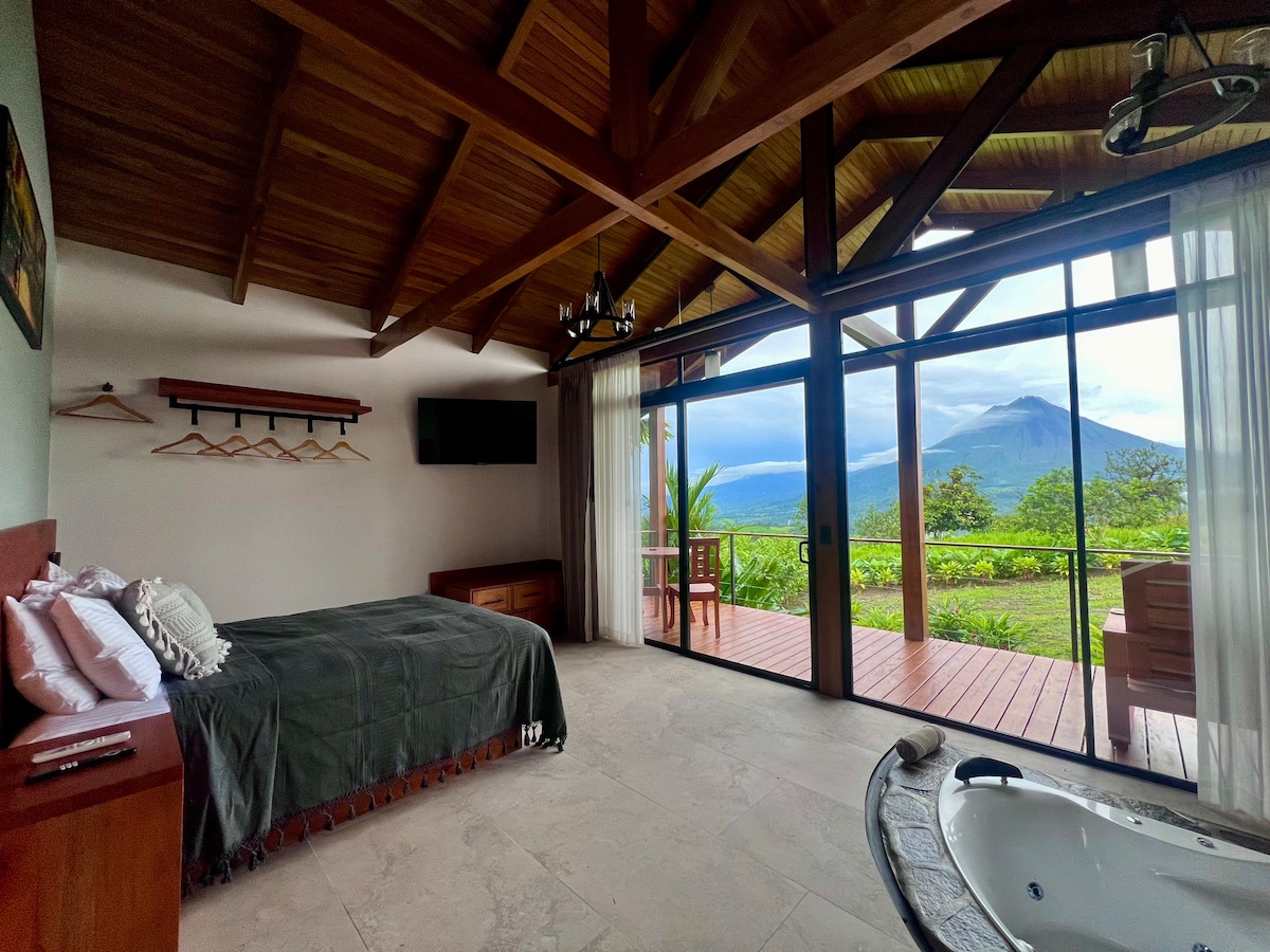 Relájate y desconecta en este alojamiento tranquilo y elegante, casita con jacuzzi privado, cocina equipada, internet de alta velocidad, hermosos jardines, fantástica vista al volcán arenal con puesta al sol, lugar privado. Piscina con agua temperada hermosa cascada deck y sillas de playa. De seguro querrás regresar nuevamente. Contamos con un Generador eléctrico para nunca tener ausencia de energía eléctrica.