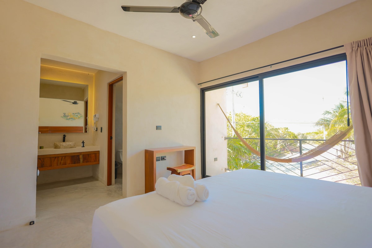 Experimenta la sinergia con la naturaleza en nuestro boho chic que combina maderas y un estilo bohemio. La idea es que te recargues de energía, que tengas los pies en la arena blanca y disfrutes bajo las palmeras desde tu hamaca. Estamos a menos de 100 pasos del mar - te encantará la arena blanca y el mar turquesa. Ofrecemos estacionamiento gratuito.