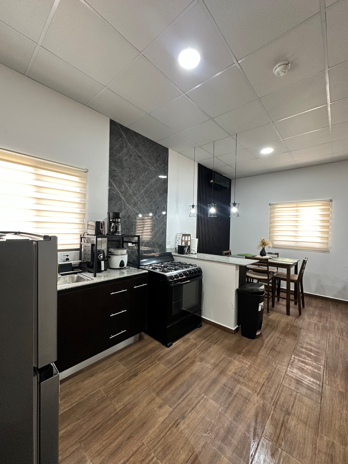 Suite con entrada independiente: estacionamiento techado, cama doble, baño sanitario, cocineta y escritorio. Tu espacio personal en el corazón de David. Cuenta con aire acondicionado tipo split, abanico de techo, TV con acceso a netflix, internet wifi gratis, cortinas black out, tanque de reserva de agua, agua caliente, cocineta equipada con estufa eléctrica, refrigerador, cafetera, microondas y utensilios básicos. No cuenta con lavandería, generador eléctrico y aislamiento acústico.