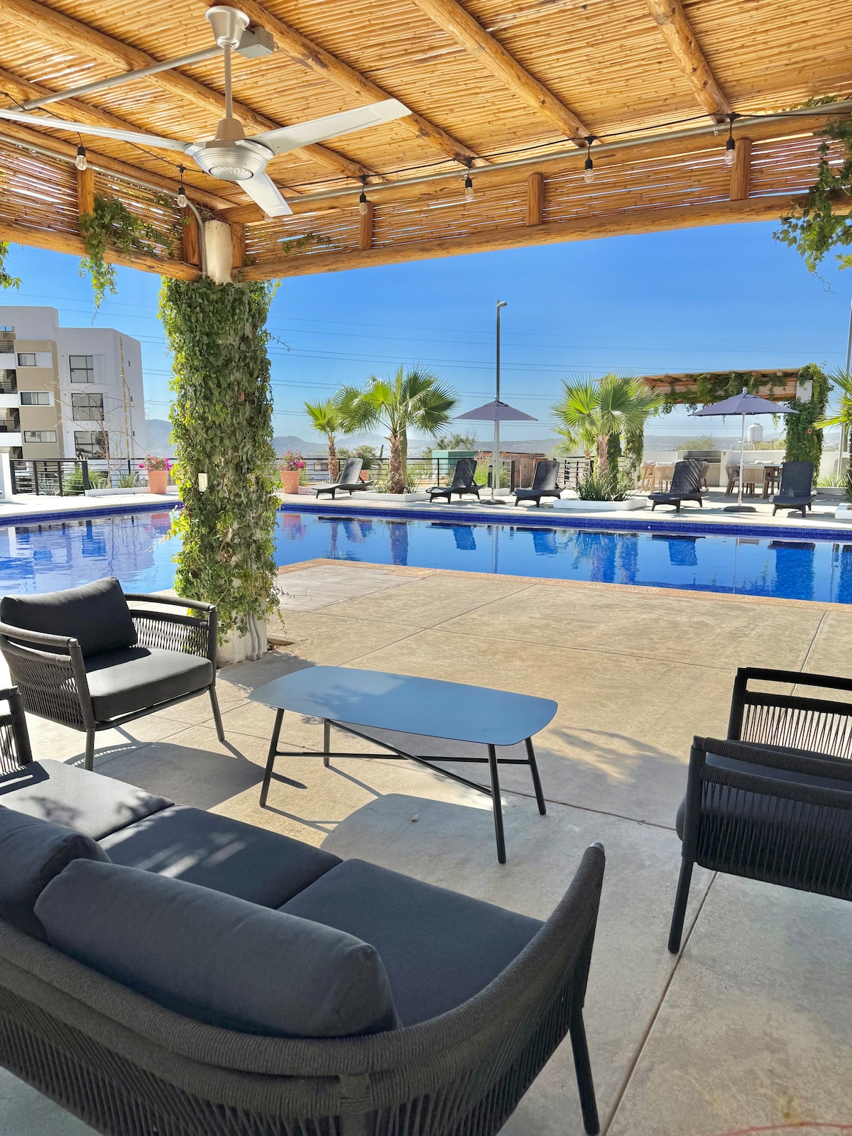 Relájate en el lujo: Sumérgete en la vibrante energía de Cabo desde este exclusivo refugio privado junto a la piscina. ¡Este impresionante santuario de 2 dormitorios y 2 baños ofrece una comodidad y unas vistas inigualables! Seguridad en las instalaciones las 24 horas, 7 días a la semana * A pocos pasos de la emoción del centro de Cabo San Lucas. * Un corto paseo a la mundialmente famosa playa del Medano y al animado puerto deportivo. Cama tamaño king, cama tamaño queen, dos baños privados, sala de estar exterior con parrilla. *No se admiten mascotas, solo se admiten animales de servicio con previo aviso.