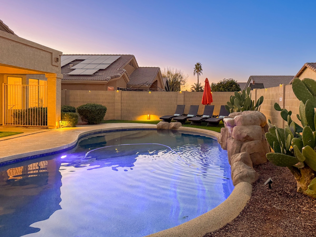Bienvenido a la casa artesanal en el desierto. Hay una gran zona al aire libre con piscina climatizada, barbacoa y mesa de fuego de propano. La calefacción de la piscina está incluida en el coste de tu estancia de octubre a mayo. Disfrutarás de entretenimiento en la cocina de chef totalmente equipada con electrodomésticos actualizados y una freidora de aire en el horno. Las cómodas camas son de espuma viscoelástica y los baños están actualizados. Evita el tráfico del día del partido/concierto y opta por un paseo fácil. Estamos ubicados a 0,8 millas del estadio State Farm.
