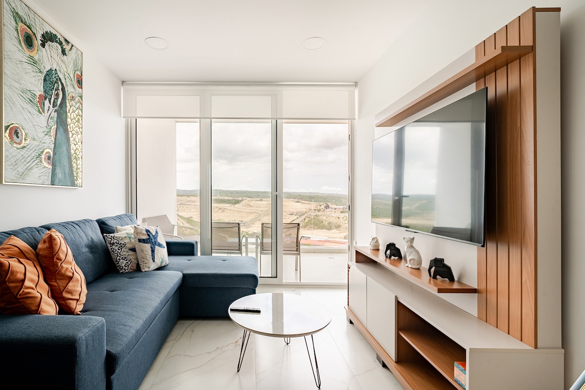 Vive una experiencia tipo resort en un edificio moderno dentro de una ciudadela privada. Disfruta piscina panorámica, jacuzzi, sauna y baño turco, gimnasio equipado con vista al mar y yoga gym. Relájate en la sala de cine privada, sala de juegos y terraza social, rodeado de amplias áreas verdes. El departamento ofrece balcón con vista al mar y la ciudad, cocina totalmente equipada para estadías largas, walk-in closet y baño privado, todo en un entorno seguro con vigilancia 24/7.