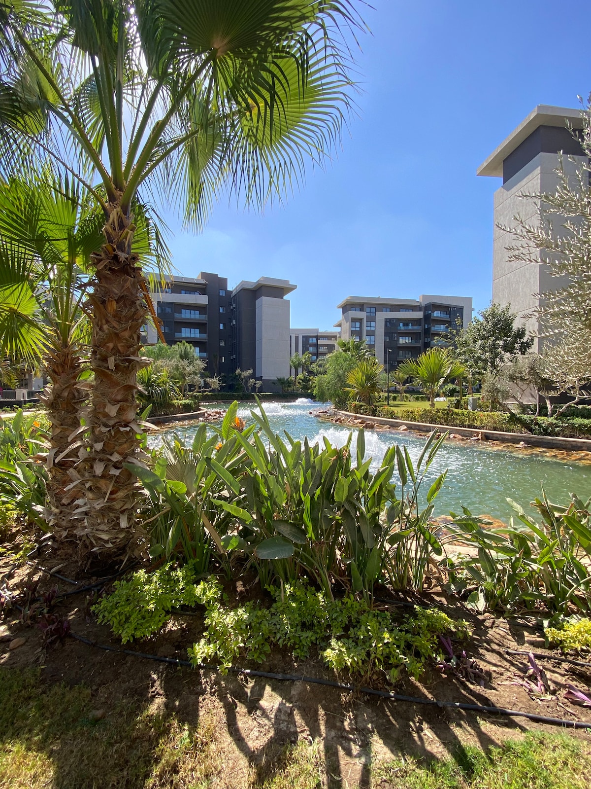 Precioso apartamento de 2 dormitorios en Privado Madinaty, con aire acondicionado, wifi y cocina completa. Amplio balcón con vistas a un hermoso lago, fuentes y una hermosa vegetación