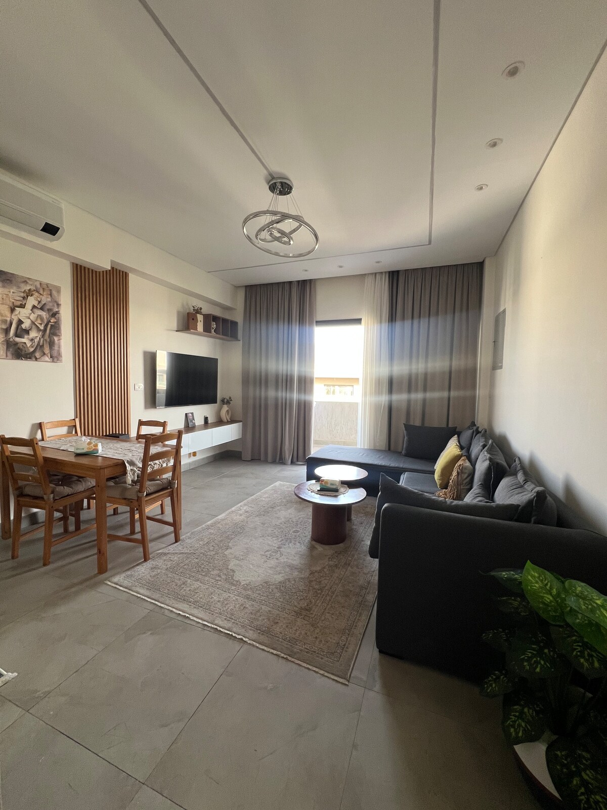 Qué ofrece este lugar • 🛏️ 2 dormitorios (1 principal con baño) + sofá cama • Capacidad para 6 huéspedes • ✨ Cómodo y con acabados modernos • ❄️ 3 aires acondicionados fríos y calientes + electrodomésticos nuevos • 📺 Smart Google TV de 65 pulgadas • 🌐 Internet de alta velocidad de fibra óptica • 🍽️ Cocina pequeña totalmente equipada • 🛋️ Gran sala de estar y comedor • 📍 A 3 minutos de Suez Road • A 8 minutos de Madinaty y Open Air Mall