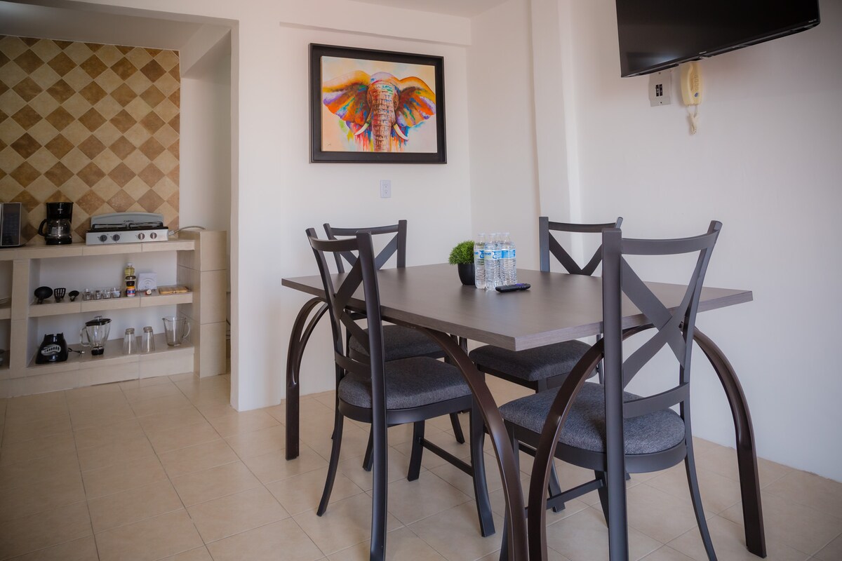 -Disfruta de una estancia tipo hotel boutique, pensada para ofrecer confort, privacidad y atención a los detalles. -Dispone de wifi y tv por cable. -Agua caliente -Cuenta con sala, comedor y cocineta. - Cortesía de agua y café. -En estancia de un día se entregará limpio el alojamiento. En largas se proporcionará lo necesario para realizarla a su gusto y se ofrece un cambio de gratuito (toallas y sábanas). -Ten la seguridad de que se están tomando medidas higiene por tu salud.