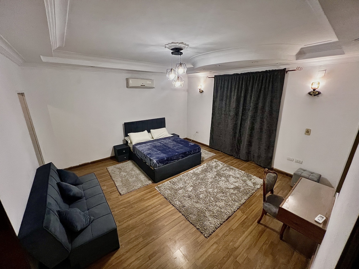 Olvídate de las preocupaciones en este gran alojamiento: ¡es un oasis de tranquilidad! Encontrarás todo lo que necesitas alrededor. Televisor ●inteligente de 65 pulgadas. ●Buena conexión wifi. ●Toallas, champú, jabón de manos, jabón para platos y papel higiénico. ●Café, té, agua embotellada. Arreglos y decoraciones especiales están disponibles por un cargo adicional. Transporte privado disponible por un cargo adicional. Comida egipcia casera de alta calidad disponible por un cargo adicional. No dudes en enviarme un mensaje de texto si necesitas aclarar algo antes de confirmar tu reserva.