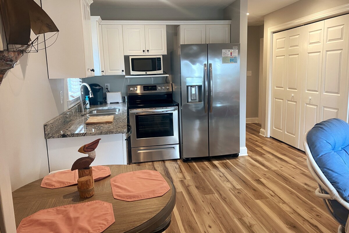 EARLY BIRD DISCOUNTS -BOOK NOW! Live like the locals in this bright, beautiful, clean 1 bedroom suite in “downtown” EI! 10 min walk to beach, 3 min walk to "little pier" on the sound. FREE gated beach parking lot just east of Bogue Pier. 2 kayaks, 2 bikes/beach chairs. Luxury shower, gorgeous full kitchen. Outdoor shower, patio, charcoal grill. Linens provided. Off street pkg. Close to everything! You must be 21 or older to book. Anyone 21 or younger must be accompanied by parent/guardian