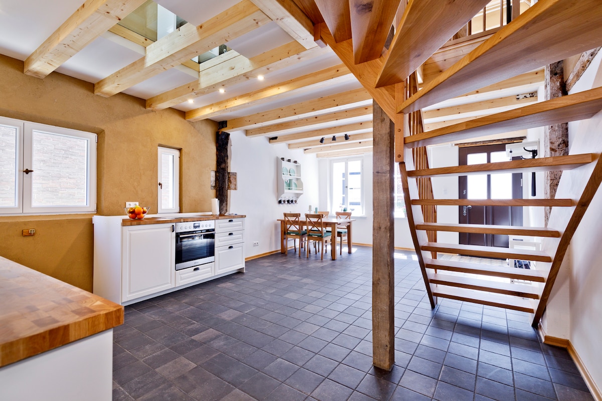 Luminoso y espacioso, con más de 50 m2, hay suficiente espacio para una estancia de lujo para 2 personas. La cocina, la habitación, el baño, el aseo separado y el dormitorio son todos nuevos y lujosos. Hemos decorado el estudio independiente con materiales de alta calidad. Como le gustaría que fuera su propia casa. Aunque no servimos desayuno, siempre proporcionamos una nevera llena de algunas bebidas, mantequilla, yogur/queso quark, huevos, mermelada a la llegada. También hay cereales, aceite/vinagre, azúcar, café y té.