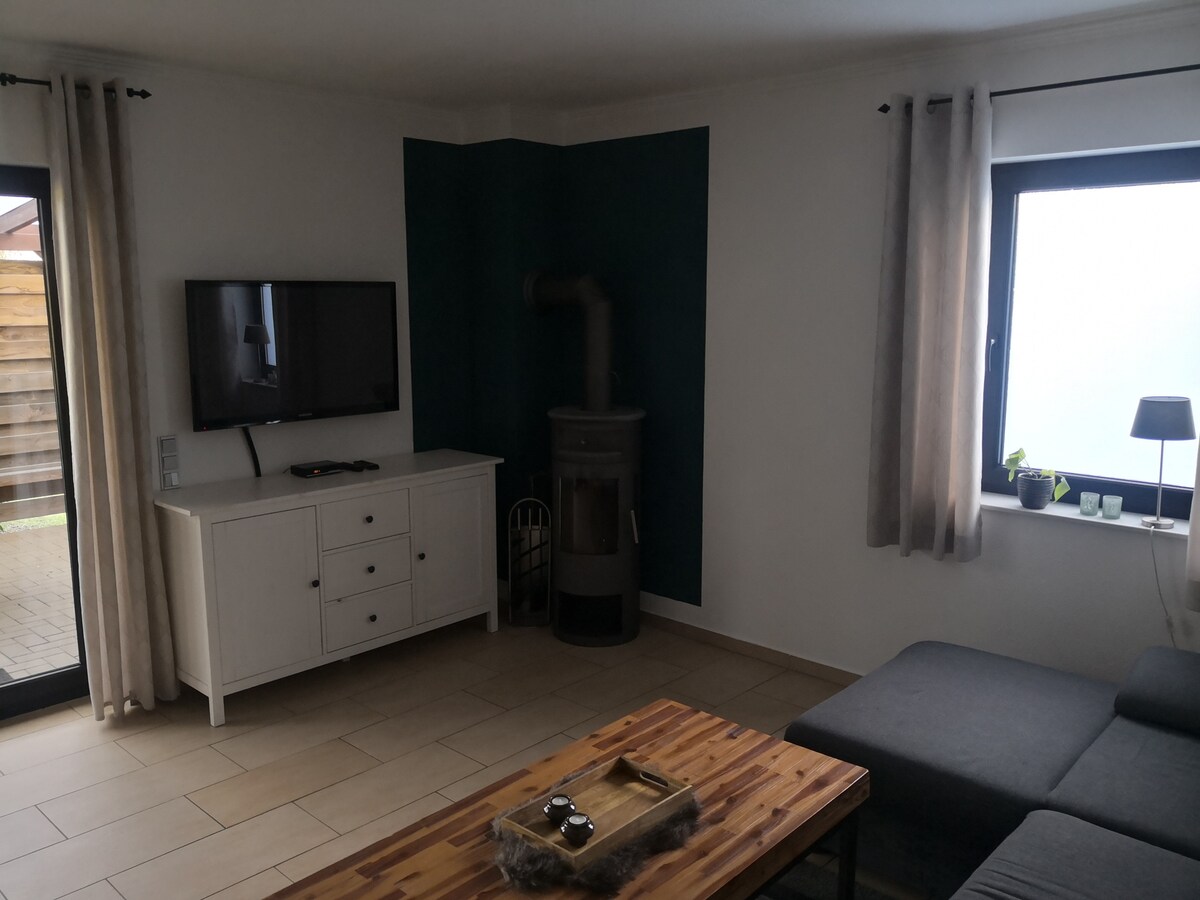 Bonita casa de vacaciones con un dormitorio grande y cocina con zona de cocción y campana extractora. También cuenta con nevera con congelador y horno/microondas. El acogedor salón de estilo rural tiene un sofá de 2 x 2 plazas y una mesa de comedor para 4 personas. El salón está equipado con una estufa de leña que se puede utilizar (bolsas de madera disponibles por 6,00 € cada una). La casa está equipada con internet y TV. Hay un cobertizo para bicicletas con cerradura y conexión eléctrica (para cargar bicicletas eléctricas).