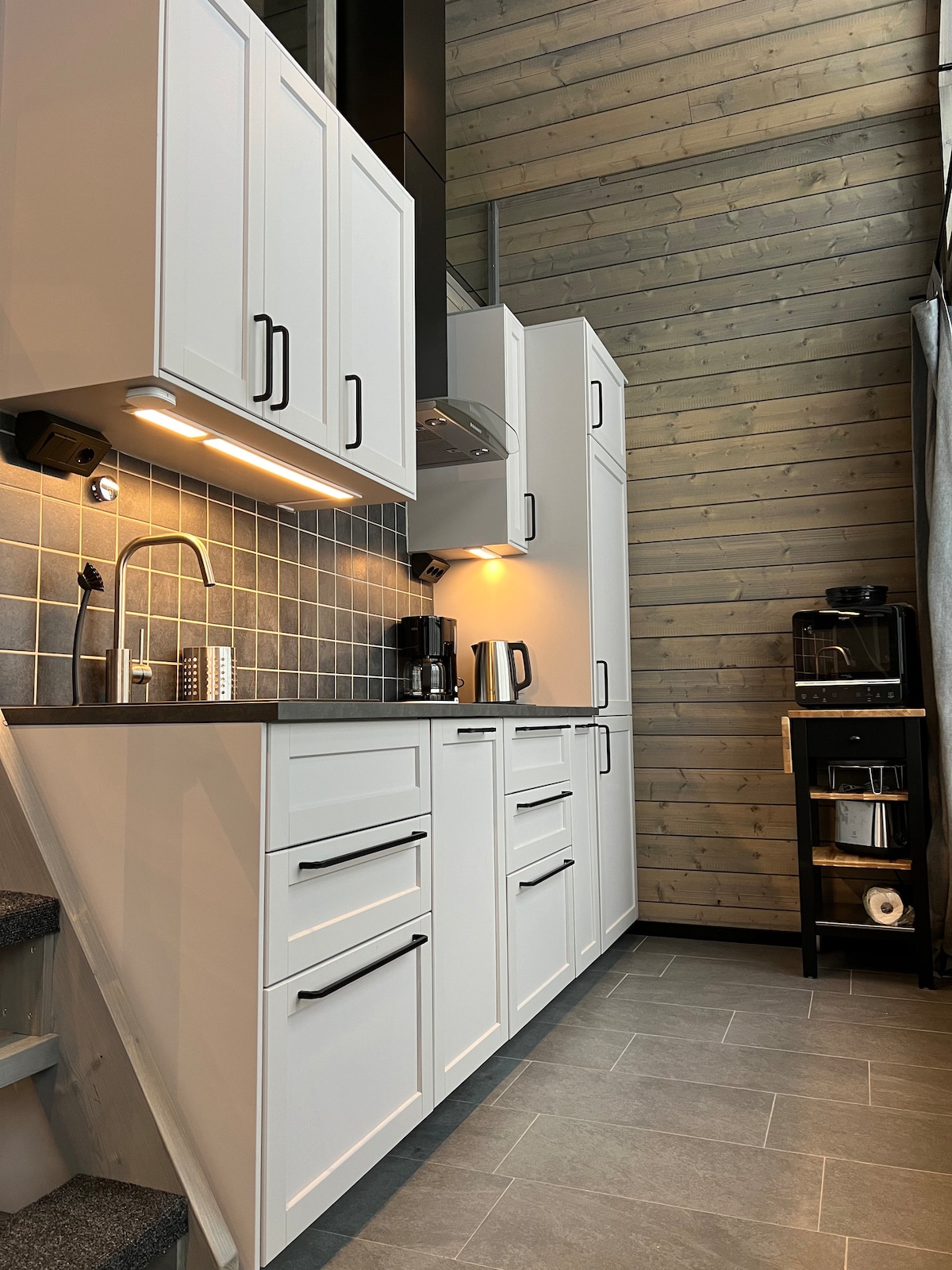 Tu escapada romántica perfecta en FURU Noruega Una hermosa cabaña orientada al sureste, con hermosas vistas al cielo y al amanecer. Interior en un esquema de color claro, radiante como largos días de verano. Disfruta de tu bañera de hidromasaje privada en el bosque por 500 NOK por estancia, reserva con antelación. Ventanas del piso al techo con cortinas opacas, calefacción por suelo radiante. Cama tamaño king, cocina pequeña con encimera de 2 placas, equipada con vajilla de alta calidad, cómoda zona de estar. Baño con ducha de efecto lluvia, lavabo e inodoro.
