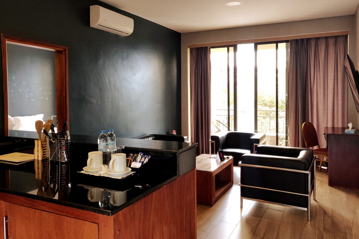 Your modern 1-Bedroom serviced Apartment with City View Balcony located in a safe modern building close to the main road just few minutes away from cozy cafes nearby, grocery shops, local markets, conveniently sorrounded by 24-hr food spots and supermarkets for all your late-nights needs, a 24-hr fully operational forex bureau and ATM in Bunga/ Buziga Rd Kampala. It's perfect for couples, business travelers, or small families looking for a relaxing and convenient stay. -STYLED FOR YOU-
