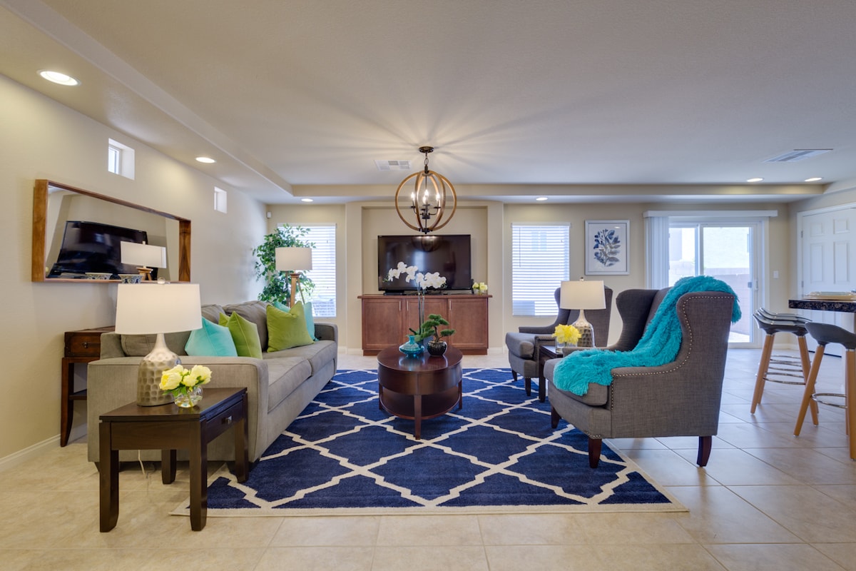 Esta nueva casa construida en 2023 es perfecta para viajes en grupo. Ubicado a solo 9 millas del Strip. Disfruta de una experiencia de lujo en este céntrico alojamiento. Ya sea que quieras aventurarte en el Strip, jugar al golf en hermosos campos verdes o experimentar el majestuoso cañón Red Rock, este es el espacio perfecto para ti. Nuestro hogar puede ser tu refugio de lujo lejos de casa. ¡Pasa tiempo con tus seres queridos y prepárate para tu próxima aventura! **Ten en cuenta que se trata de una casa estrictamente sin fiestas.**