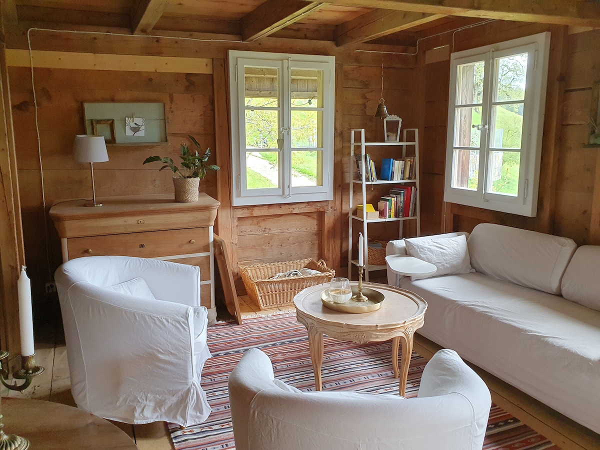 Tu refugio perfecto en el valle de Emmental. Aquí podrás relajarte en un ambiente idílico y un entorno cuidadosamente diseñado, y sumergirte en el maravilloso paisaje natural de la región de Napf. Ofrecemos un granero rústico con dormitorio, sala de estar personal con mesa de comedor, zona de estar, zona de cocina, así como terraza, balcón y jardín. El lavadero, el lavabo y el aseo se encuentran en el exterior. La ducha es de libre acceso y se encuentra en la casa de campo cercana.