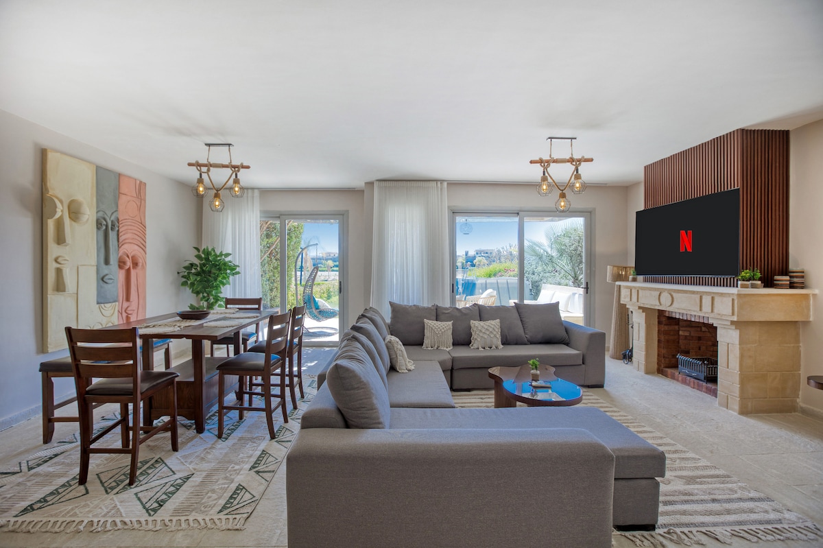 Aquí encontraste el hogar paradisíaco a 2 horas de El Cairo. Esta villa de 2 pisos se encuentra en el complejo Lasiesta. Tiene 6 dormitorios y 2 habitaciones para niñera/conductor en el exterior, 5 baños y una piscina desbordante con vistas impresionantes del mar rojo desde la cima de la montaña. Perfecto para unas vacaciones familiares acogedoras, cómodas y grandes. Puede alojar a 12 personas cómodamente más 4 miembros del personal. ¡Bienvenido!