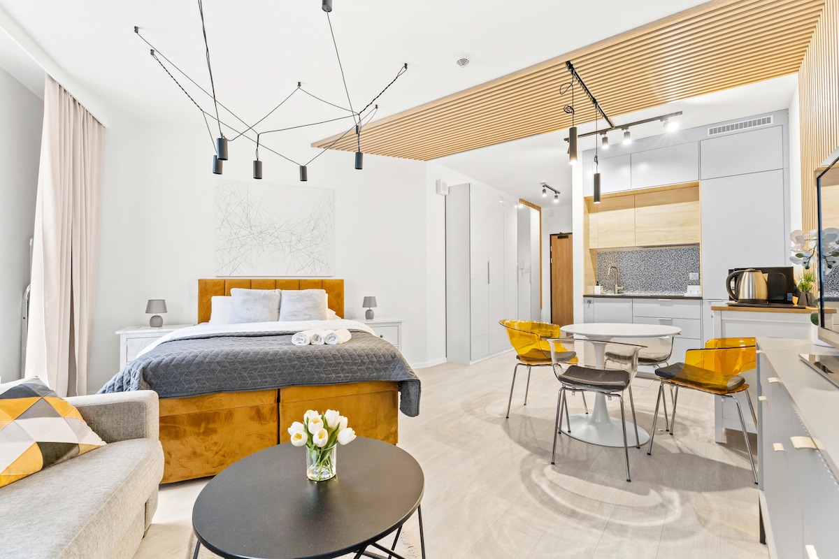Espacio moderno y acogedor con capacidad para un máximo de 4 huéspedes. Con un diseño de planta abierta, el estudio combina a la perfección el dormitorio, la sala de estar y la pequeña cocina. Disfruta de la terraza de la azotea, el gimnasio, el espacio de coworking y la sala de juegos para niños en el edificio. A poca distancia a pie: casco antiguo a 10 minutos, Museo de la Segunda Guerra Mundial a 5 minutos, la iglesia de Santa María, la noria Amber Sky y el astillero Gdanski a un paso de distancia. ¡Elige el alojamiento adecuado en Gdansk!