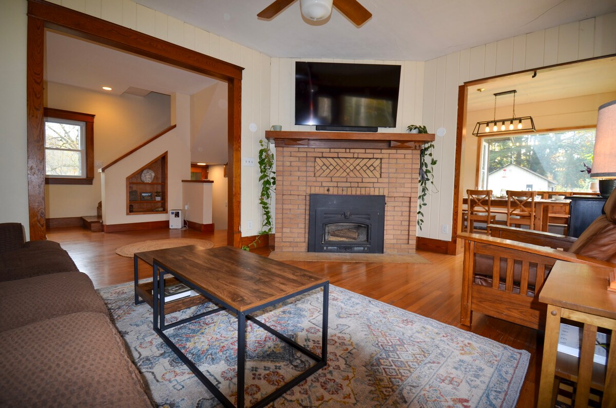 Destacada en Buffalo Spree y Artvoice, esta casa con estructura de madera cuenta con impresionantes interiores de nogal negro e hickory iluminados por ventanas de dos pisos que dan al sol de la mañana. Calefacción por suelo radiante y diseño climático de yeso de tierra. Despiértate en camas tamaño queen y king, relájate bajo terrazas cubiertas y compra justo al lado en la tienda de productos orgánicos de Thorpe. • A 7 minutos del pueblo de East Aurora. • A 24 minutos del estadio Bills. • A 1 hora de las cataratas del Niágara.