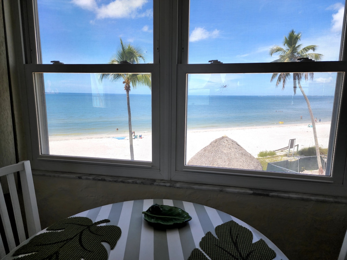 ¡Somos Superanfitriones por una razón! ¡La siesta de Sanibel se ve increíble! Inmaculada frente a la playa, 2BR, 2BA con garaje, unidad de playa muy bien actualizada en el borde de la arena. Cocina equipada. ¡Vistas increíbles del golfo con calificaciones de 5 estrellas! Mínimo 3 días. ¡Nuevas ventanas a prueba de huracanes, muy bien equipadas y con ASCENSOR EN EL EDIFICIO! Descuento para alquileres semanales/meses. Habitación 1: Cama king, baño privado, televisión inteligente. Habitación 2: 2 camas individuales, Smart TV. Sofá cama Qn. en LR. Piscina, campo de golf, bicicletas, lavandería en el lugar. No hay alimentos ni condimentos almacenados en la unidad. Puede admitir perros pequeños.