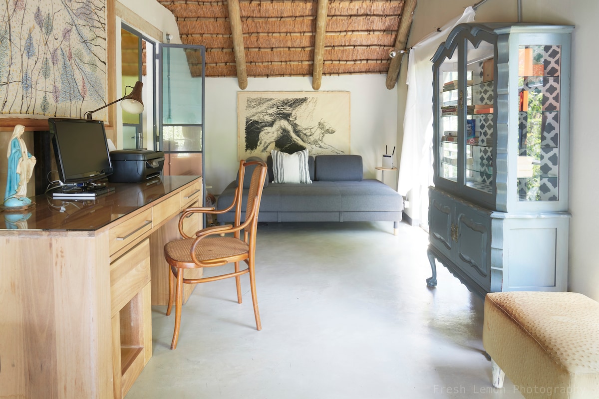 Surrounded by luscious greenery and birdlife, with an interior upmarket touch of Africa, this property features an open plan lounge, kitchen and dining area, with a separate large and sunny bedroom with aircon, walkthrough dressing area/office, and bathroom with bath and shower. The private entrance includes a patio with outdoor dining area and braai (barbeque). Solar back-up power provides continued lights, TV and internet access during power outages or loadshedding.