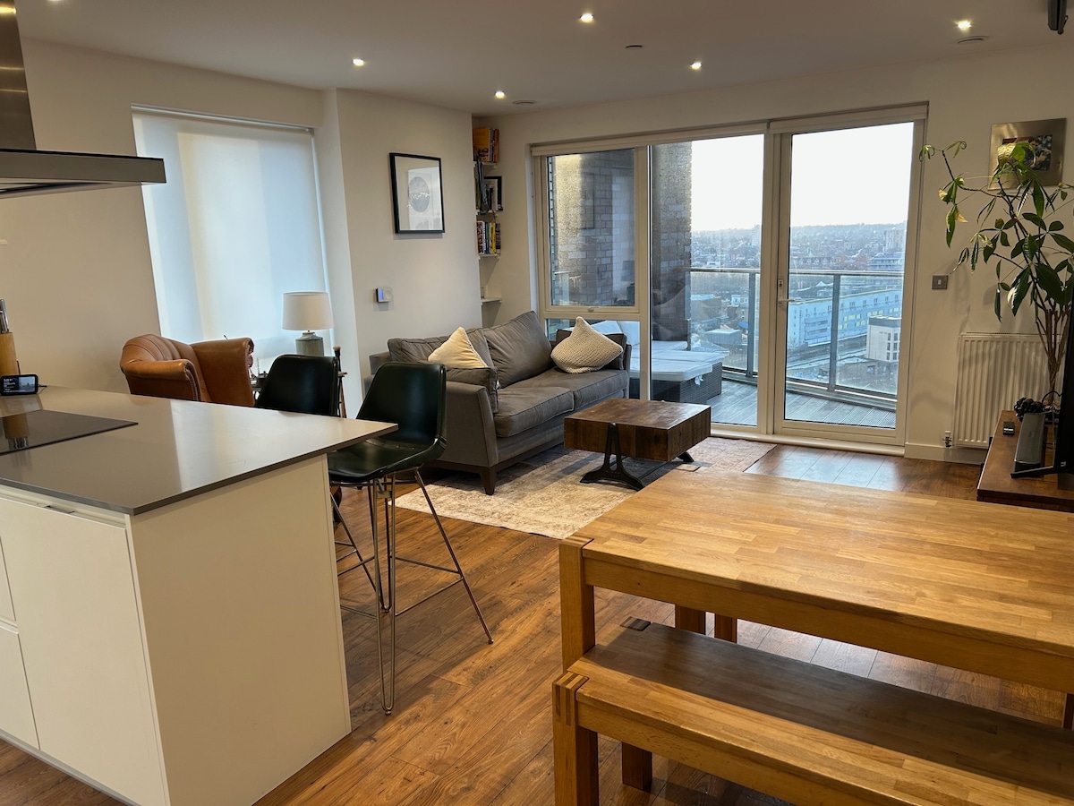 Sunny top floor apartment with AirCon & Stunning panoramic view of London (as on pictures) Two double bedrooms Two bathrooms Fully furnished Well equipped Luxury beddings & towels Spotless clean and quiet Free parking (request in advance ) Private Gym Private fenced community garden 5 min walk to ExCeL 1 min walk to Tesco Express supermarket Next to DLR station, Cable Car, near Elizabeth line CustomHouse station , short journey to The O2 arena, Canary Wharf, The City, LCY