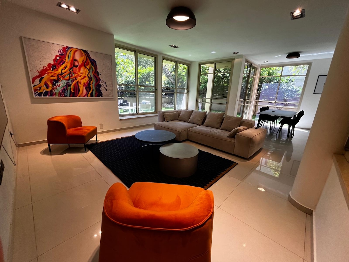 Nuestra casa de 5 pisos es un tranquilo oasis en medio de toda la acción del mercado Carmel y a 5 minutos a pie de la playa. Es una nueva villa (¡azul!) con un jardín privado donde puedes hacer una barbacoa, un sótano donde los niños pueden tocar XBOX o piano y 4 dormitorios, uno de los cuales está en la azotea con vistas a la ciudad. La principal revista de diseño de Israel la llamó la casa más hermosa de Tel Aviv, la llamamos hogar y esperamos que te sientas como en casa mientras te quedas aquí.