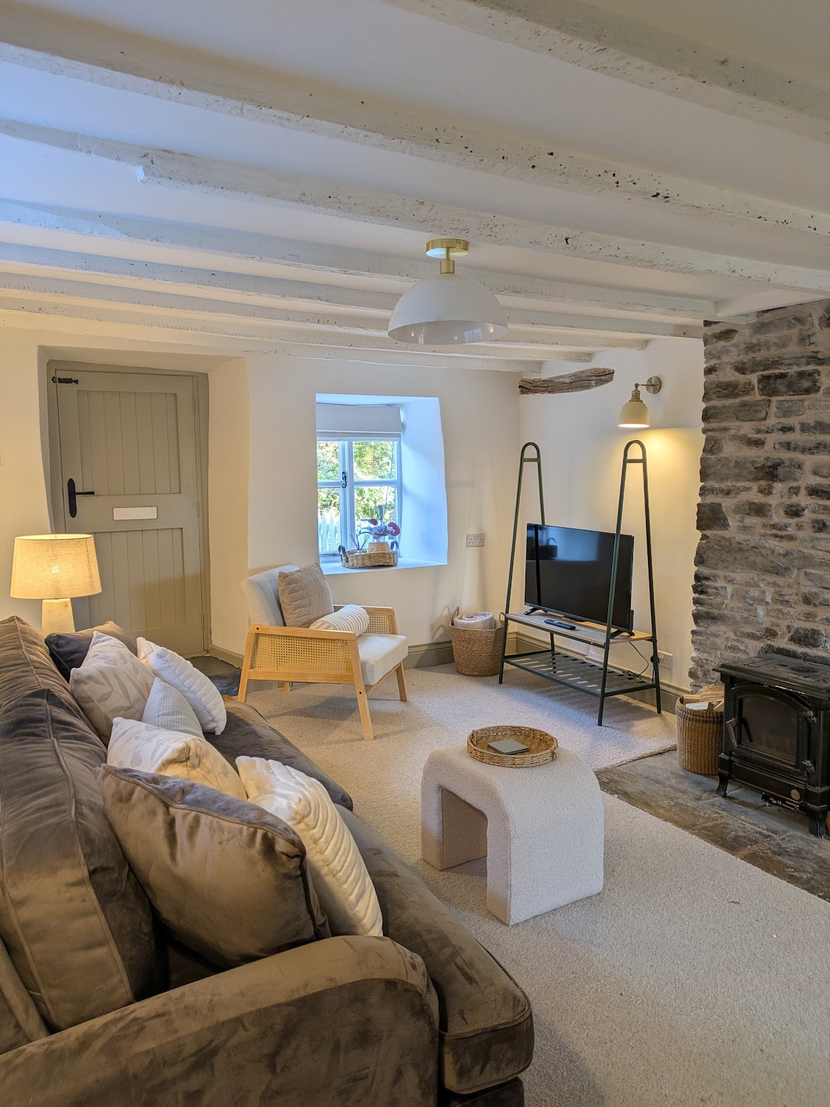 Hace más de 20 años convertimos la antigua pocilga, y recientemente hemos hecho una reforma completa. Ahora tiene un acogedor refugio con un sofá, así como un salón con vistas de gran alcance. Hay un baño privado y una planta baja, una ducha y un inodoro. El dormitorio está en un entrepiso con una cama de granja gruesa tamaño king con un colchón extremadamente cómodo. El salón tiene un sofá Laura Ashley y una silla acolchada colocada para disfrutar de unas vistas de gran alcance o un televisor de 43 pulgadas si lo prefieres.