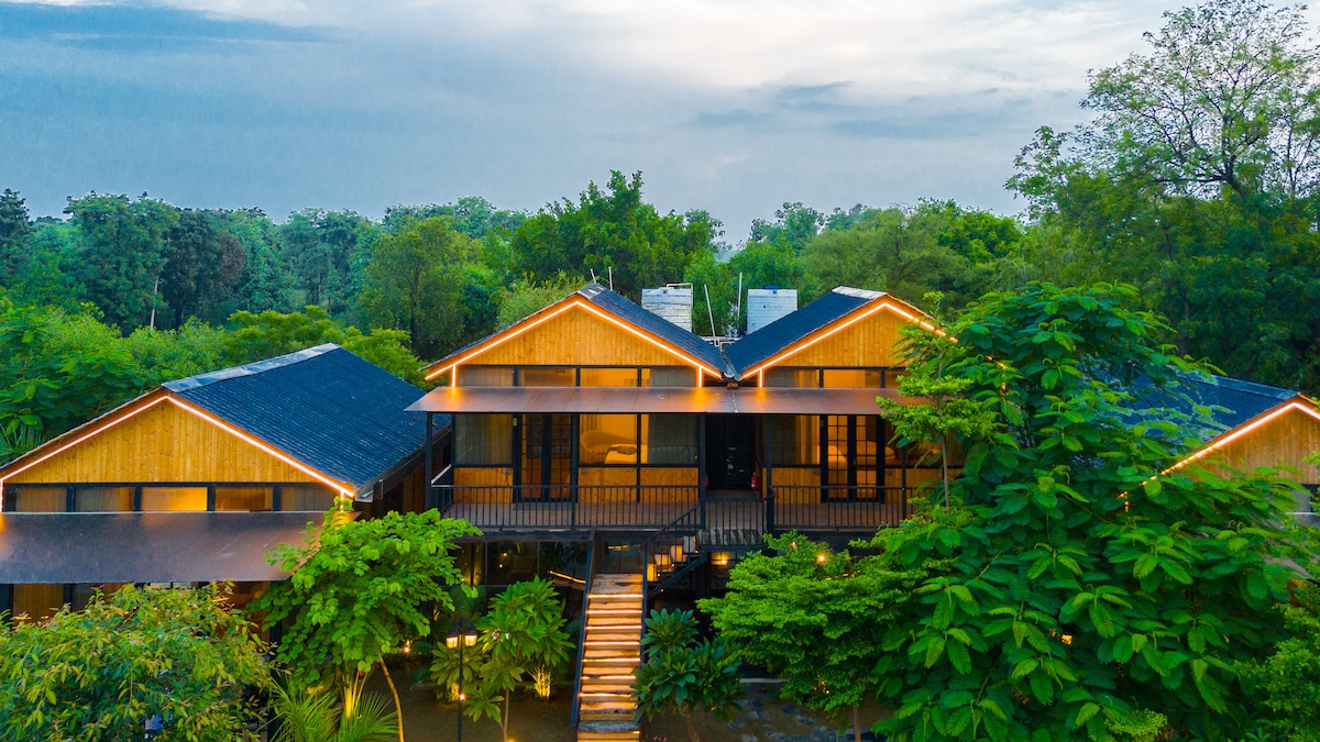 Ubicada en 5,5 acres dentro de un bosque, esta villa de 4 dormitorios apta para mascotas ofrece vistas al bosque, una piscina privada, cenador, jardín en el patio y zona de juegos. En el interior hay una sala de estar y un comedor, mientras que el resort cuenta con una piscina compartida, gimnasio, sauna, restaurante, biblioteca y salón. Rodeado de huertos de frutas y verduras con amplios jardines, es ideal para reuniones. Cerca de Khori Jamalpur Jheel y Mini Ladakh, combina comodidad con naturaleza.