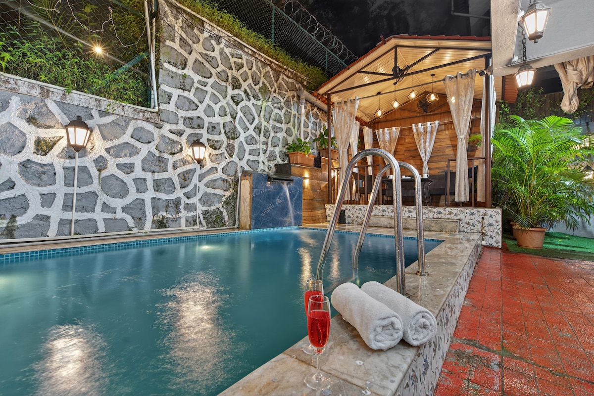 'Villa Elsewhere' es una lujosa y hermosa villa con piscina privada, a solo 60-90 minutos en coche de Bombay. Rodeado de exuberantes vistas verdes de campos, colinas y sonidos de la naturaleza. La villa tiene 3 dormitorios con aire acondicionado en suite, una gran sala de estar con aire acondicionado que se abre a una piscina privada y una gran terraza con un bar. La cocina está totalmente equipada donde un chef puede preparar comidas deliciosas (* cargo adicional). Se admiten mascotas (* tarifa adicional). ¡RESERVA para relajarte en un ambiente tranquilo, para una reunión o para organizar la mejor parte de la historia!