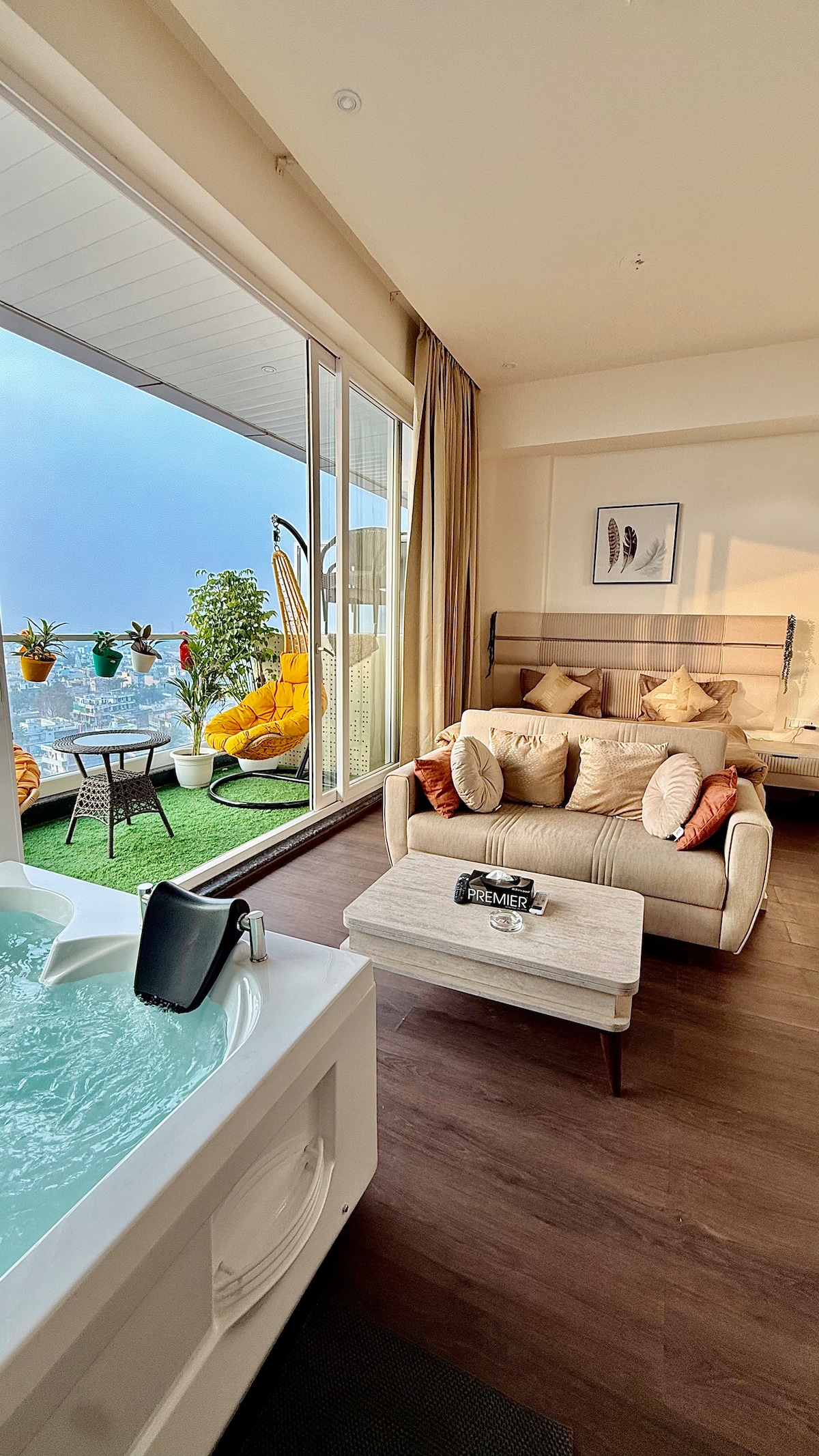Welcome to Luxury private studio on 11th floor at Satya The Hive, Sector 102, Gurgaon. This beautifully designed private room features a serene patio with planters and swings, a private Jacuzzi ideal for couples offering the perfect setting for relaxation, and a private entrance for complete privacy. Includes a fully equipped kitchenette, luxurious private washroom is designed with modern fittings & beautiful mirror & essential toiletries. Perfect for a romantic getaway or a peaceful city stay.
