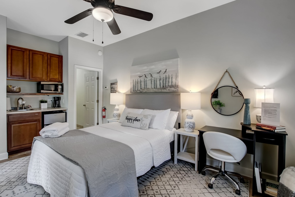 Your Island getaway awaits! You’ll love our cheerful, private access gem. Central location makes exploring a breeze. Less than 5min from historic downtown shops, restaurants, trails, jogging, golf, horse rides, surf, even skydiving! Enjoy a Queen bed, wifi, TV, small kitchenette, coffee station, laundry room w/Wash&Dryer, (baby Pack&Play), updated bathroom, work desk, covered parking, patio & more! Note: Verified ID's & a few positive (Airbnb or similar) reviews are all that's needed.