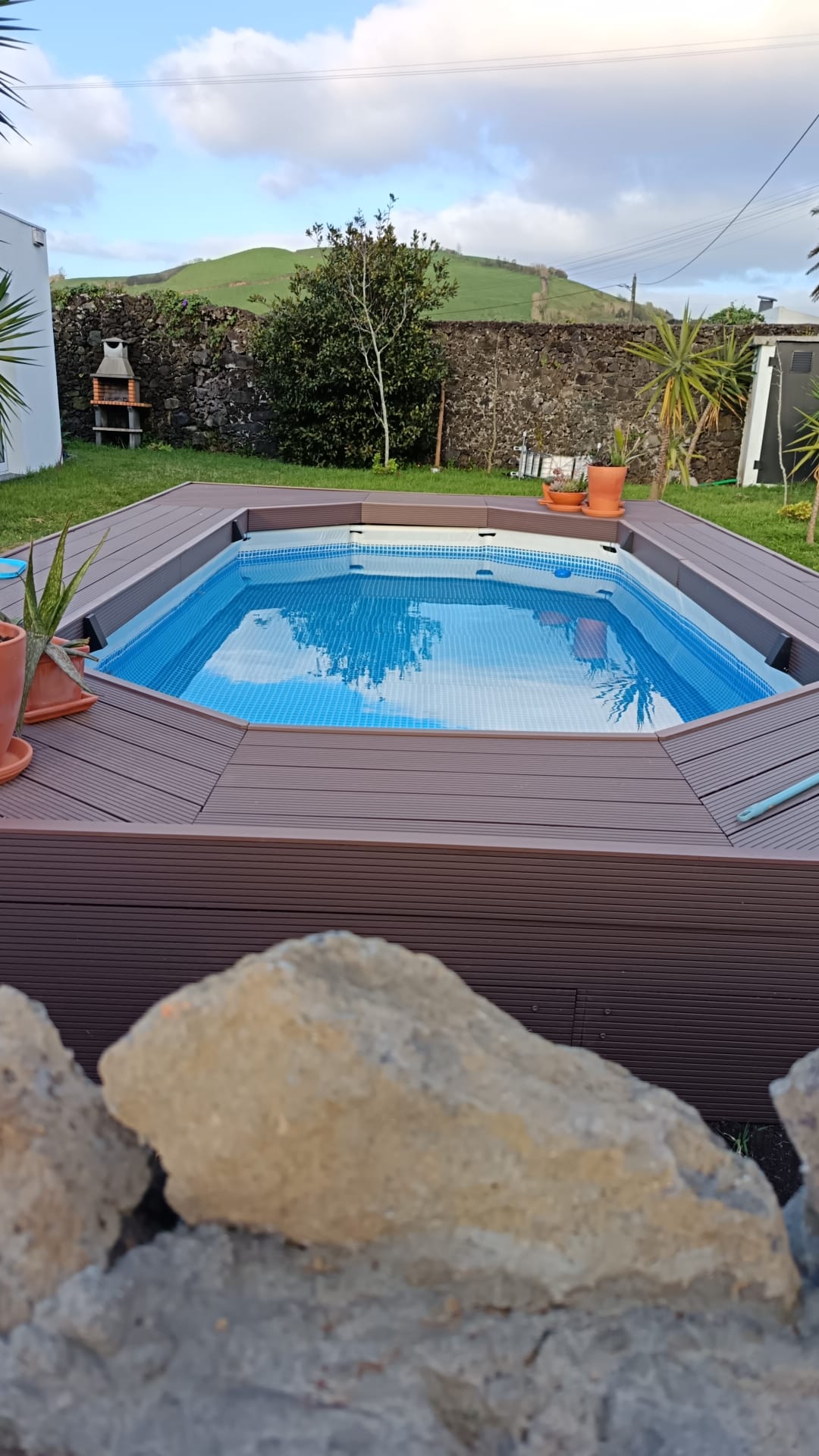 Acogedoras cabañas de madera sobre el pintoresco pueblo pesquero de Mosteiros, en un paraíso con jardines, ¡con excelentes vistas al Atlántico! Cada casa tiene su privacidad (parte del jardín propio), con su propia zona de barbacoa y nuestra piscina (1,60 de profundidad continua), es muy popular entre todos los huéspedes. Casa para dos a 4 personas, perfectamente equipada para autoservicio, por ejemplo, con microondas. Televisión alemana, calefacción por infrarrojos para la temporada de nevera y tarjeta de viaje para Internet independiente.
