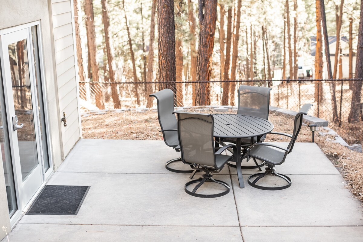 Cómoda estancia cerca de Flg y Sedona. Disfruta de un baño de hidromasaje al aire libre entre los pinos en este apartamento limpio, acogedor, espacioso y privado en el sótano de mi casa. El barrio forestal está a diez minutos al sur de Flagstaff. Visita Sedona, Snowbowl y Grand Cnyn. Hermosa luz natural en todas partes. Relájate en el jacuzzi al aire libre (se requiere antes de la ducha, batas en el armario) o dentro en el columpio único del sofá. Gran colchón tamaño king y ropa de cama acogedora. Barrio agradable con hermosas caminatas por el bosque. Cocina completa.