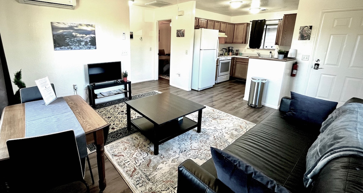 Como nativos de cuarta generación de Flagstaff, estamos orgullosos de ofrecer este espacio. Nueva construcción con un toque moderno pero cómodo. ¡Nueva bañera de hidromasaje! Cocina completa que incluye: estufa/horno, refrigerador (con máquina de hielo), microondas, lavavajillas, ollas y sartenes, platos, cubiertos, licuadora y tostadora. Incluso ofrecemos café y té. Lavadora y secadora en la unidad. Un dormitorio con una cama tamaño king y espacio en el armario. Un baño completo. Sofá cama en el área de la sala de estar para huéspedes adicionales. Solo una nota, no permitimos mascotas