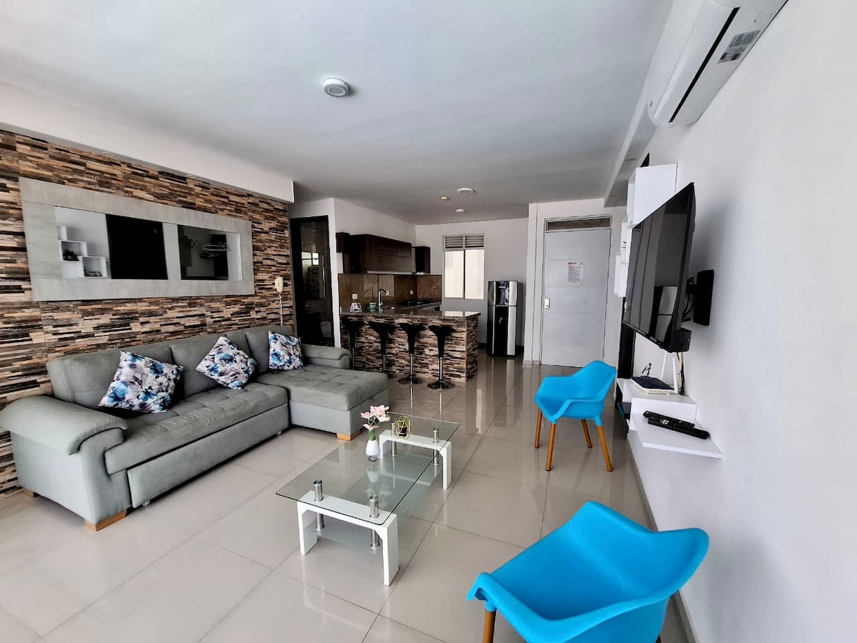 Magnifico apartamento con espectacular vista, completamente dotado. Dos habitaciones cada una con aire acondicionado. Wifi, Smart TV en sala y habitaciónes con las aplicaciones de Streaming (Ingresar con sus propias cuentas debido a las políticas de las plataformas), BBQ gas natural en balcón, hamaca. Conjunto con jacuzzi, piscinas, tenis de mesa, billar pool, futbolín, gimnasio. Complejo deportivo con canchas de tenis, futbol 5, cancha múltiple, parque infantil e iglesias
