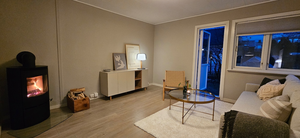 Modene enebolig med svært sentral beliggenhet, nærmeste nabo med busstopp. Boligen har også god plass til parkering av flere biler. Boligen er nyoppusset og innehar høy standard. Svært vellutstyrt kjøkken med alt dere skulle trenge. Skjermet uteplass og egen plen med god boltreplass. Også mulighet for lading av elbil mot et tillegg i prisen. Katten (Olav) følger også med oppholdet, han er ekstremt snill og rolig. Har egen katteluke, han er utendørs ca. 20-22 timer i døgnet avhengi av vær.