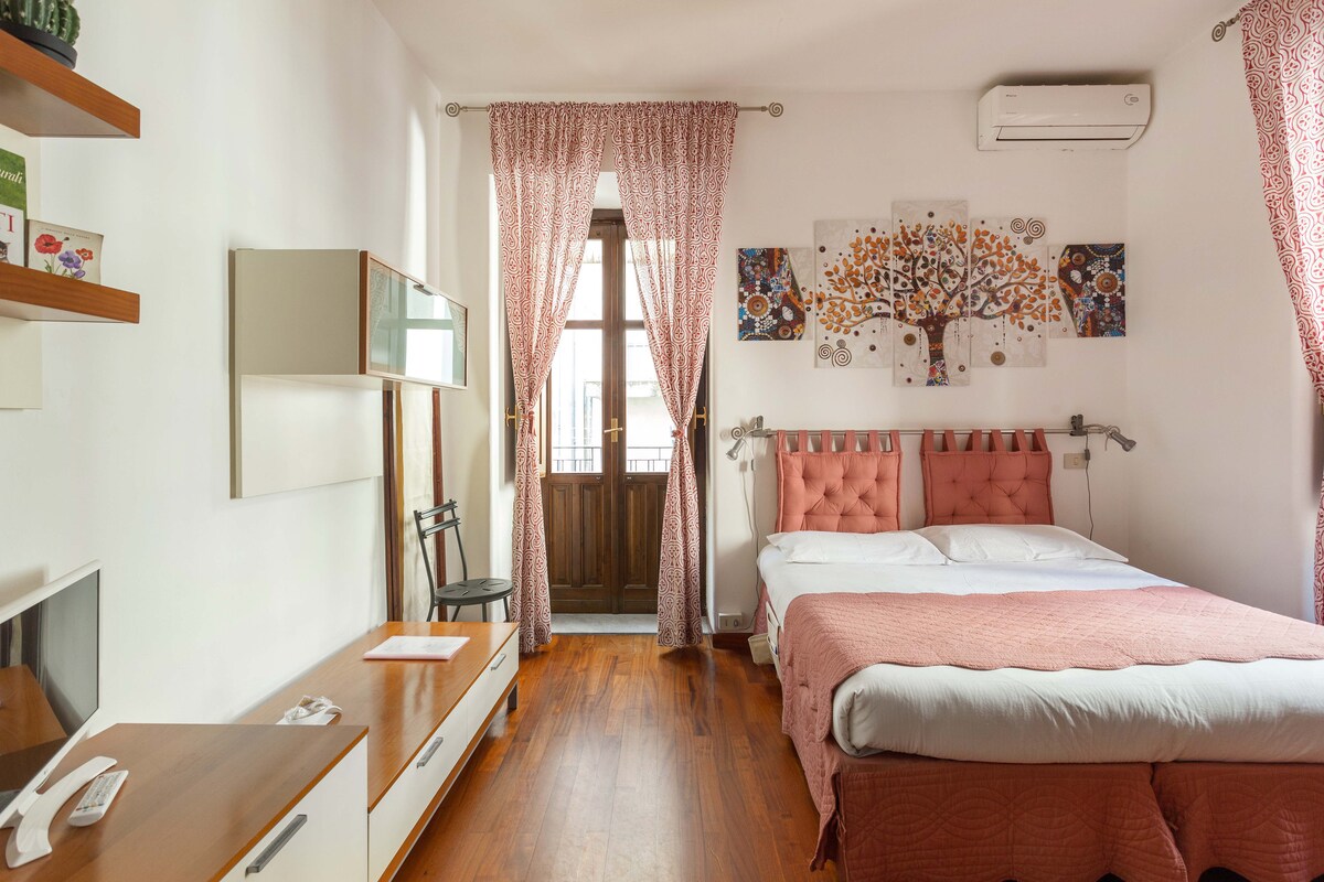 en la zona más evocadora del centro. El apartamento con un estilo elegante, mezclado entre lo antiguo y lo moderno y equipado con muebles de gran calidad. Dos camas muy cómodas, dobles e individuales. El balcón da a la animada Via Penninello,Via Etnea y Via Crociferi -Villa Cerami. Electrodomésticos de alta calidad (lavadora-secadora - TV digital - aire acondicionado /bomba de calor, nevera y cocina de inducción) que garantizan estancias cómodas y satisfactorias, incluso para estancias medias o largas.