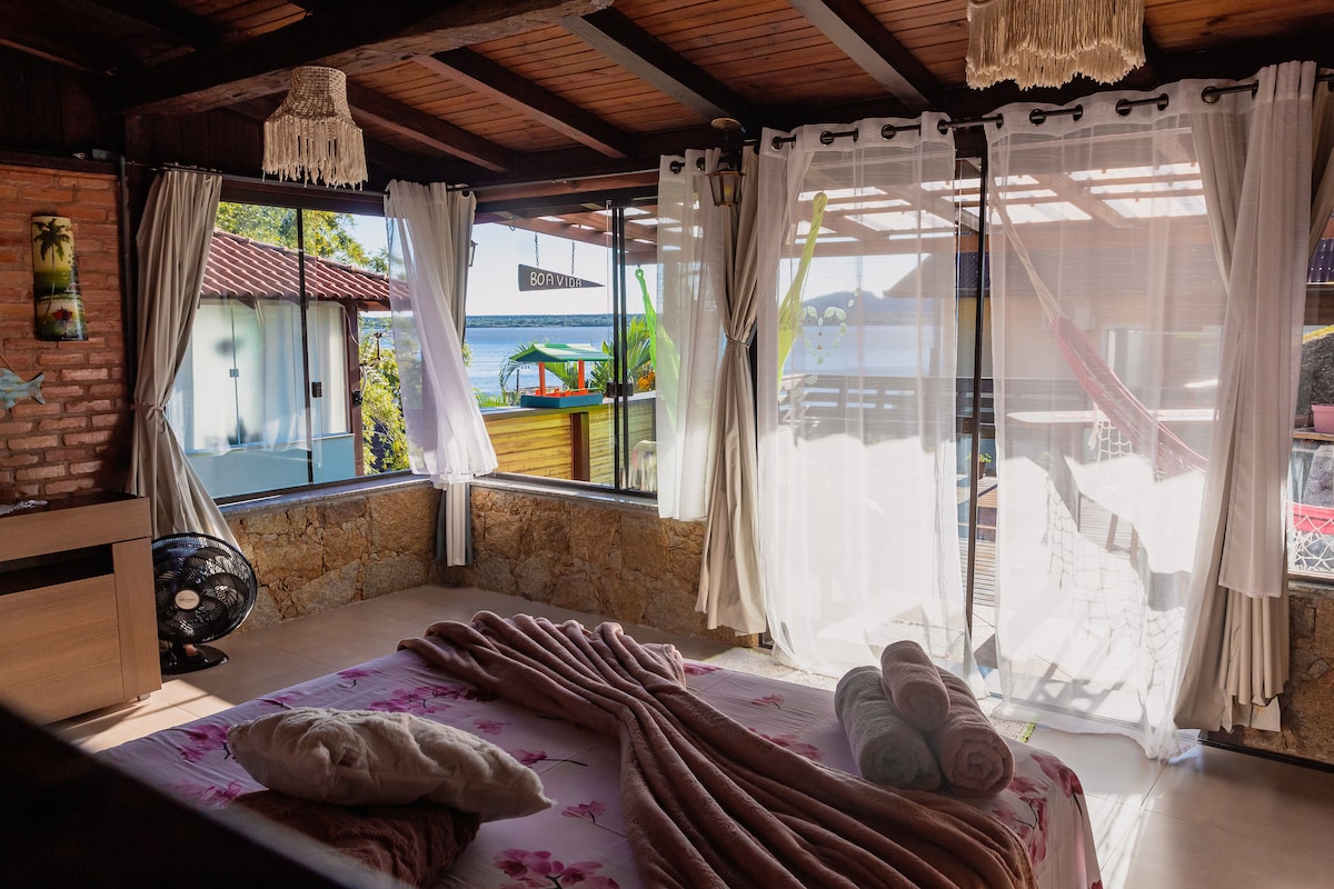Casita de estilo rústico frente a la playa de Ponta das Canas, en la zona más aislada. Incluso con la capacidad máxima en la isla, aquí hay un rincón reservado. Hay dos formas de llegar a la playa que se encuentra frente a la propiedad: por la calle (300 m) o, para quienes les guste aventurarse, por la laguna (de agua salada), que ofrece un paisaje increíble y está repleta de gaviotas. Ideal para quienes aman la naturaleza. Ventana de dormitorio con una hermosa vista a la laguna. Aquí también puede disfrutar del jardín con parrilla.