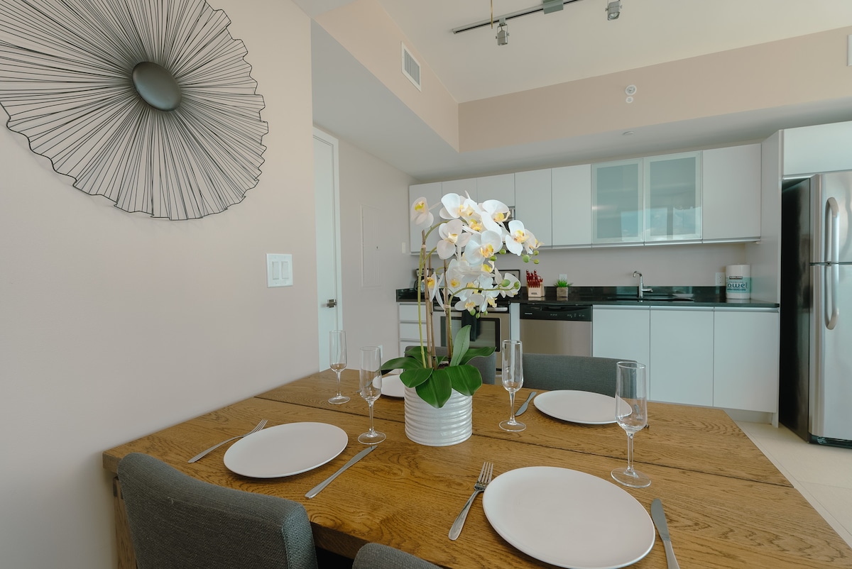**Experimenta el centro de Miami con estilo** Alójate en esta residencia del piso 17 diseñada por uno de los mejores diseñadores de Nueva York. Con 690 pies cuadrados de elegancia, disfruta de muebles de lujo, obras de arte seleccionadas, impresionantes vistas de la ciudad y servicios de primera calidad, creando una escapada urbana verdaderamente única y elegante. **Ubicación privilegiada:** A pocos pasos del estadio, del mercado de Bayside, de los museos y frente a la estación de Metromover para un acceso perfecto a la ciudad. Este refugio tropical-chic es tu escapada perfecta a Miami.