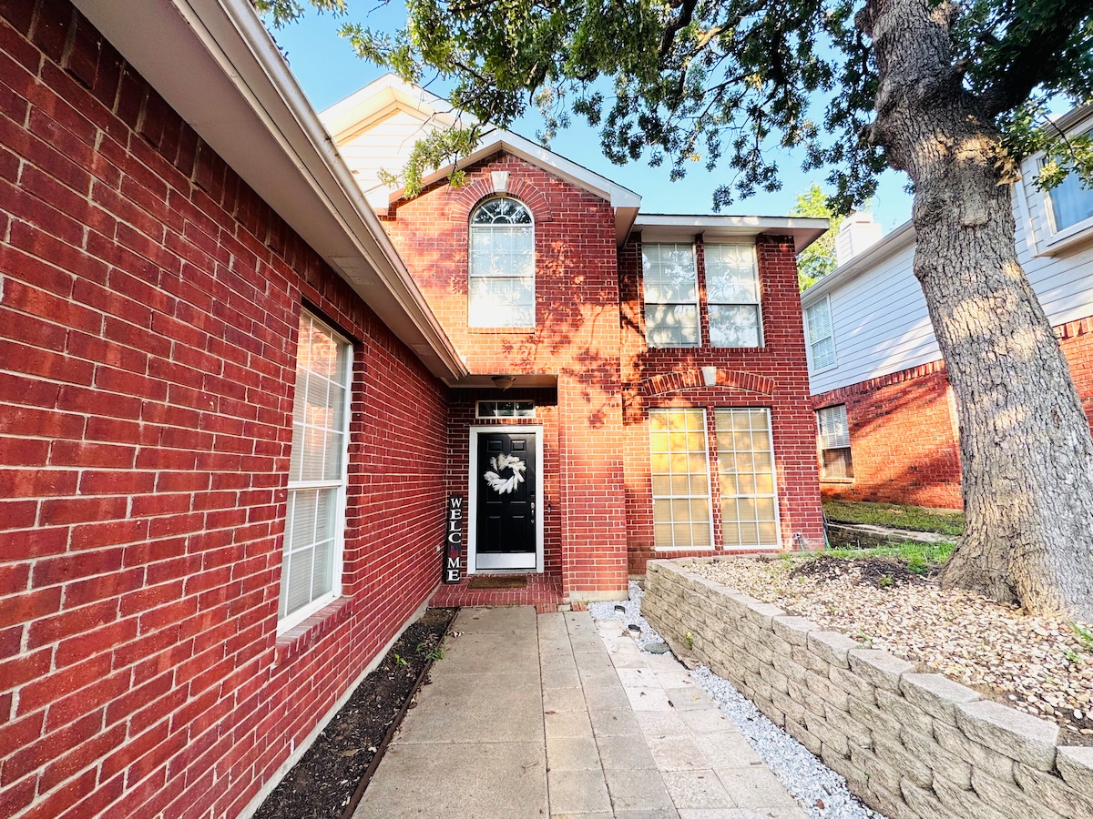 Relájate con toda la familia en este tranquilo refugio. Nuestra cómoda casa de 3 dormitorios y 2 baños ofrece un interior elegante. Se encuentra en una calle sin salida en un barrio seguro y a poca distancia a pie del parque con parque infantil, campo de fútbol, cancha de baloncesto y lago. Fácil acceso al aeropuerto DFW, Cowboy Stadium, Texas Motor Speedway, tiendas y mucho más. Hemos decorado pensando en la acogedora sensación familiar; nuestro objetivo es que en tu viaje te sientas como en casa.