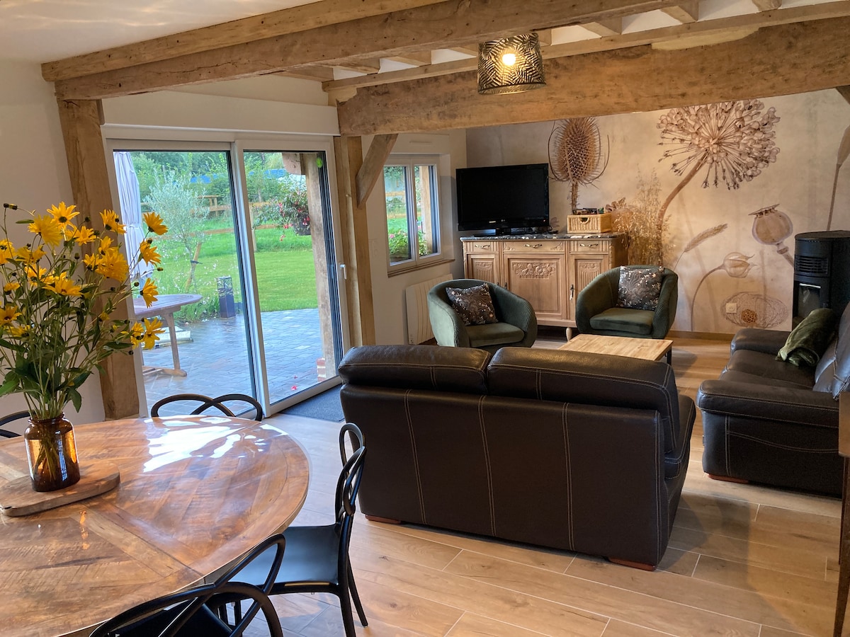 Una bonita villa en el corazón de Normandía con una superficie de 70 m2 con materiales de alta gama y piscina climatizada durante todo el año en una parcela cerrada de 1500 m2 con entrada y estacionamiento privados Un pedazo de paraíso moderno y cálido. Los ventanales ofrecen una gran luminosidad y vistas a la piscina climatizada y al parque. Nada de roscas, están solos en la casa de campo Un lugar perfecto para relajarse en familia, en pareja o en amigos. Se puede proporcionar un equipo para bebés