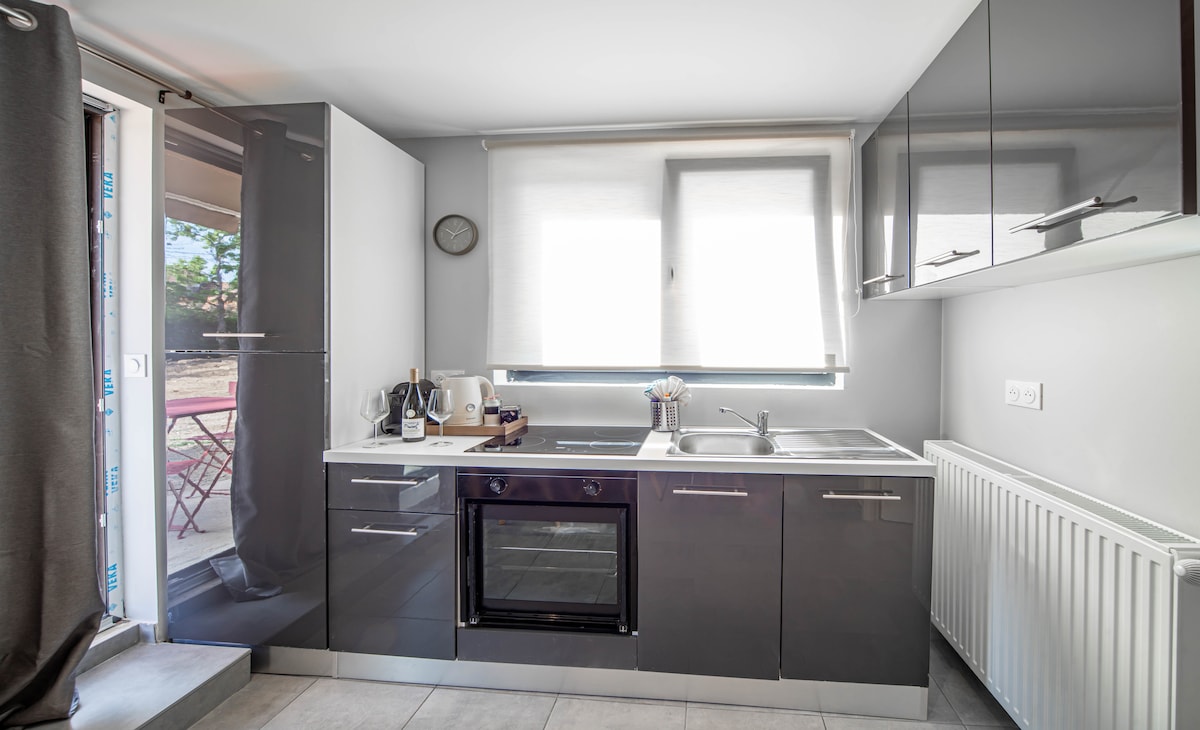 Pequeña casa (Guesthouse) tranquila, completamente renovada, con vistas a un patio privado con terraza, barbacoa y zona de relajación, dentro de la cocina equipada, gran ducha a ras de suelo, cama king size (180x200) todo con aire acondicionado. Para mayor comodidad encontrará a su llegada lo básico ( sal, pimienta, azúcar, té , café, ..) y una cama ya preparada, así como los artículos de aseo, toallas .