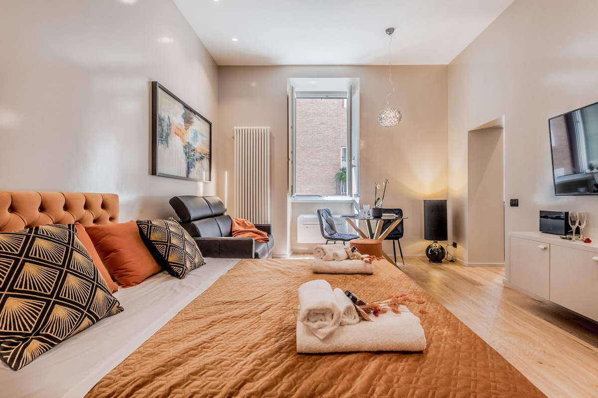 ¿Buscas una estancia especial en el corazón de Roma? Imagina despertarte a un paso de la plaza de España, rodeado de boutiques, cafés históricos y las calles más emblemáticas de Roma. En unos minutos a pie llegarás a la Fontana de Trevi, la Piazza Del Popolo y el Panteón. A tu regreso, déjate mimar por los muebles de diseño, el aire acondicionado y el wifi rápido, para relajarte después de un día de descubrimientos. Vive Roma como protagonista, entre la elegancia y la autenticidad.